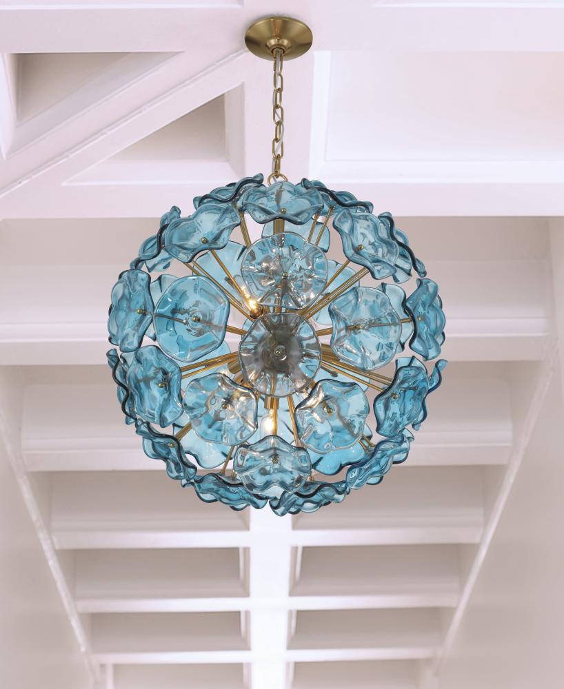 Its spherical core anchors an array of brass rods extending outward culminating in hand-blown art glass shaped like delicate flower petals.