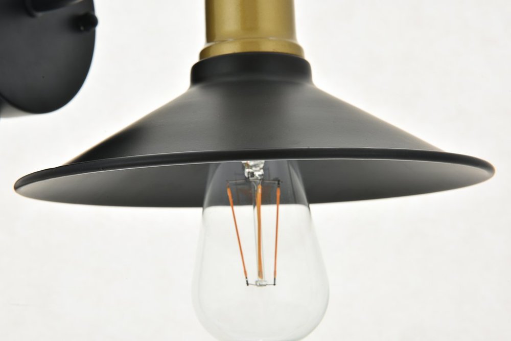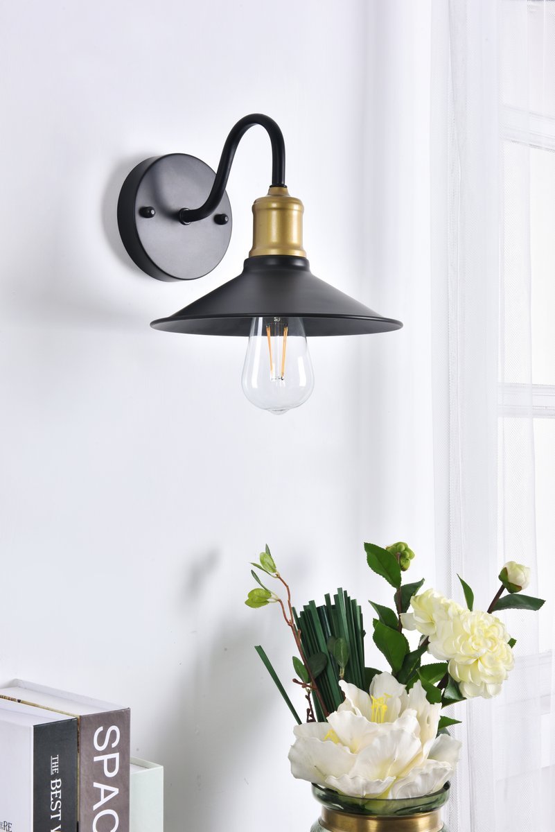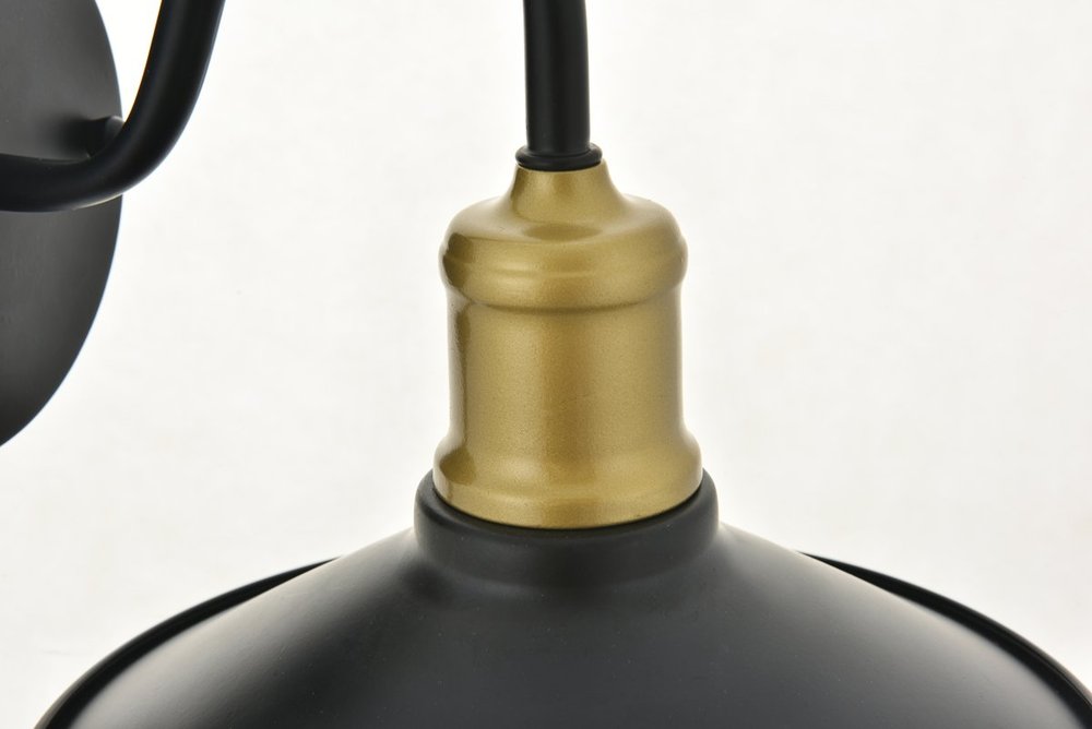 Two-toned brass and black finish wall sconce with a curved arm and cone shaped shade