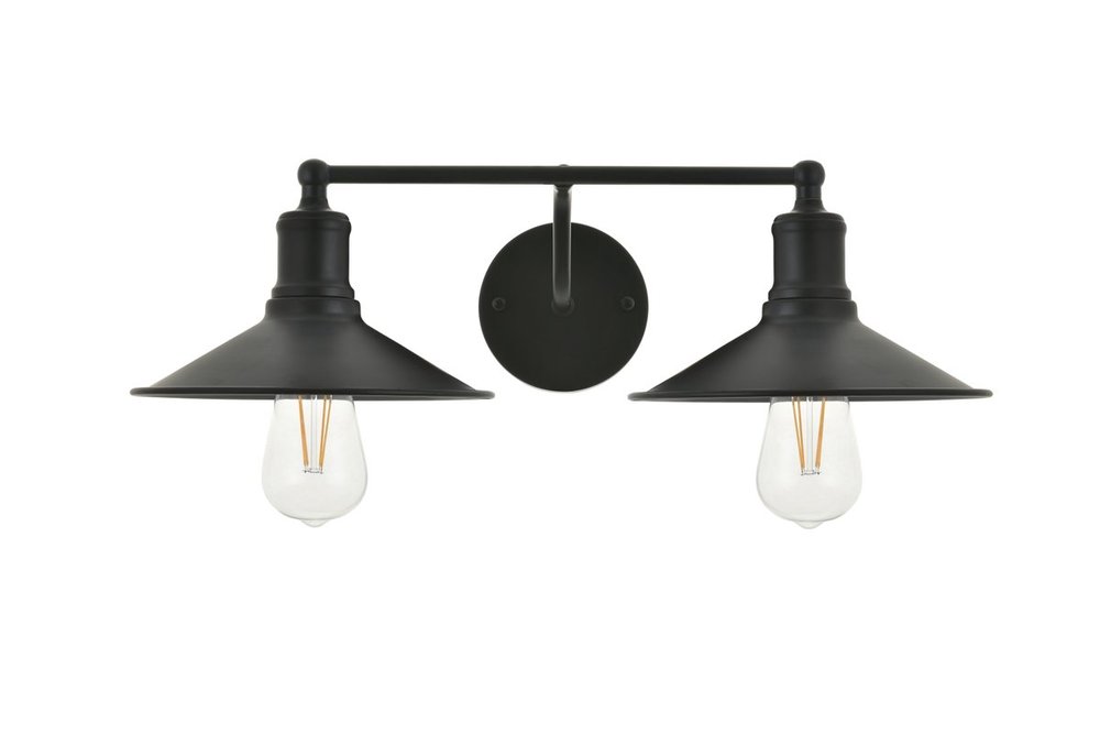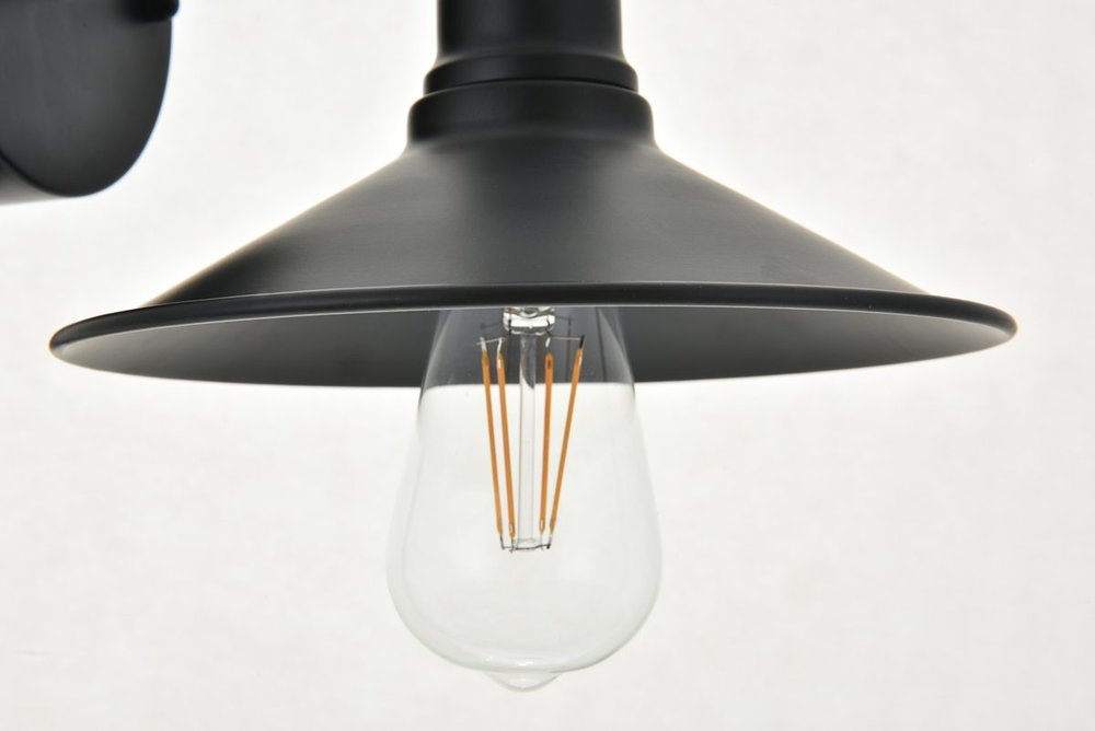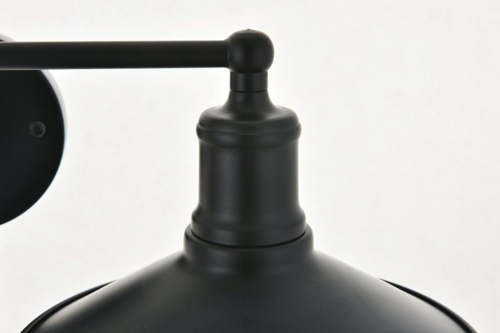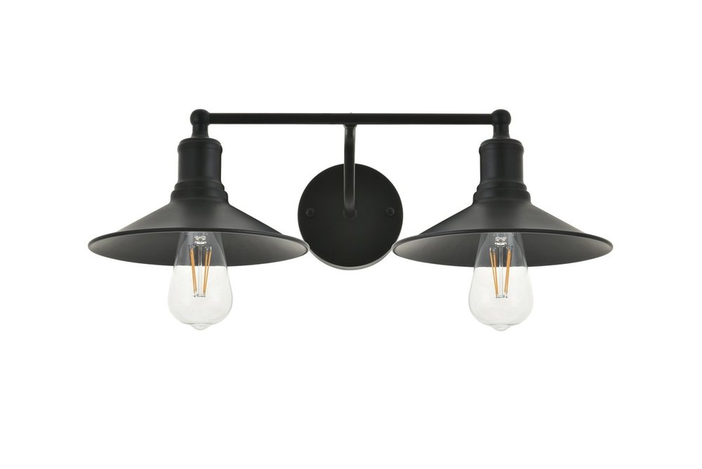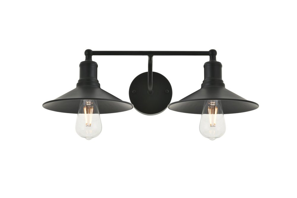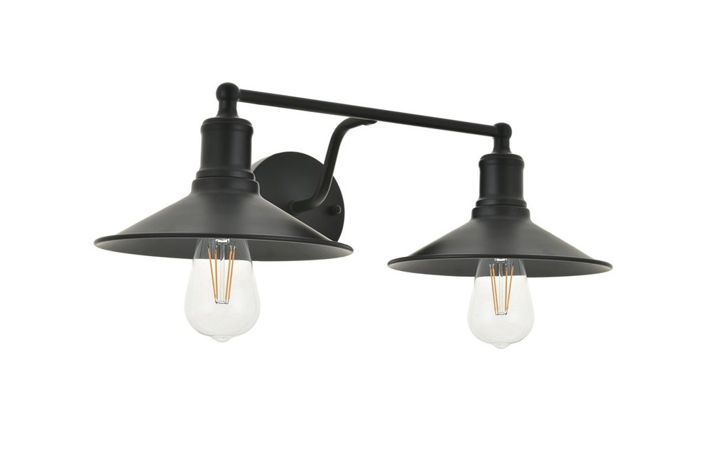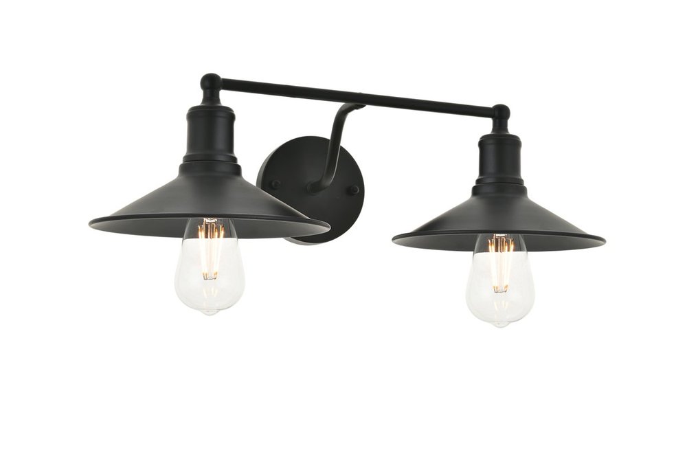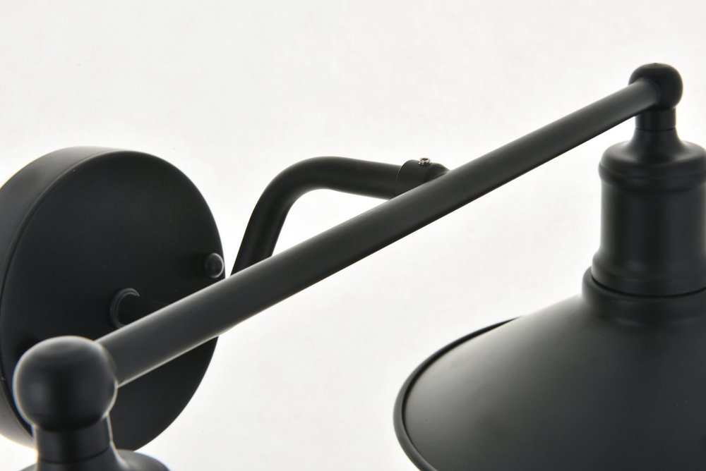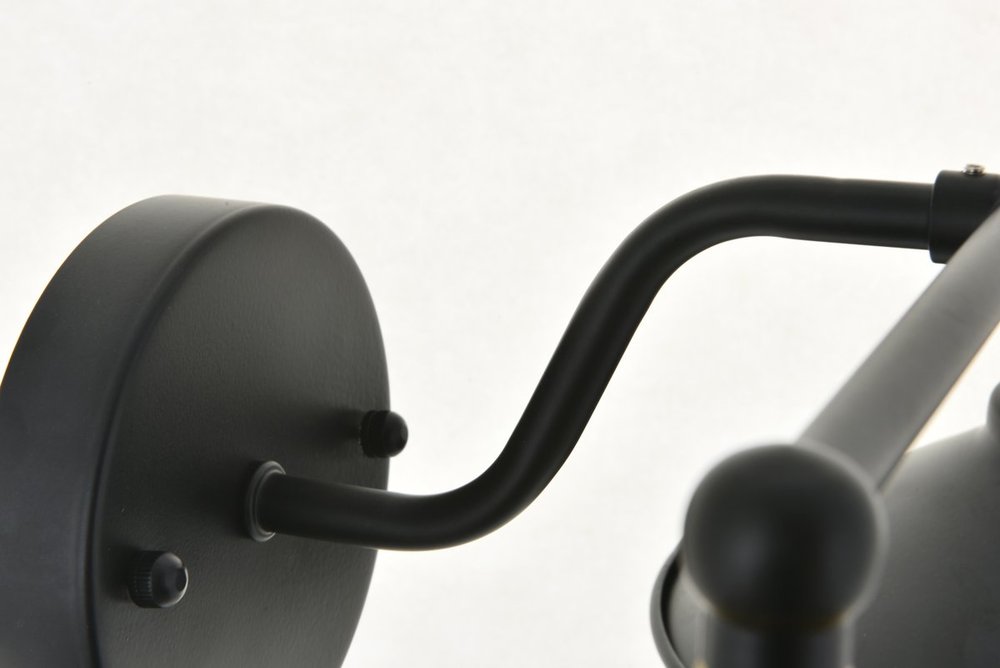 Black finish 2-light wall sconce with a curved arm and cone shaped shade