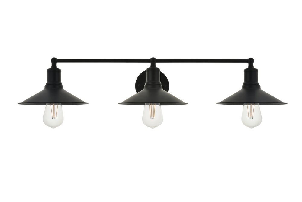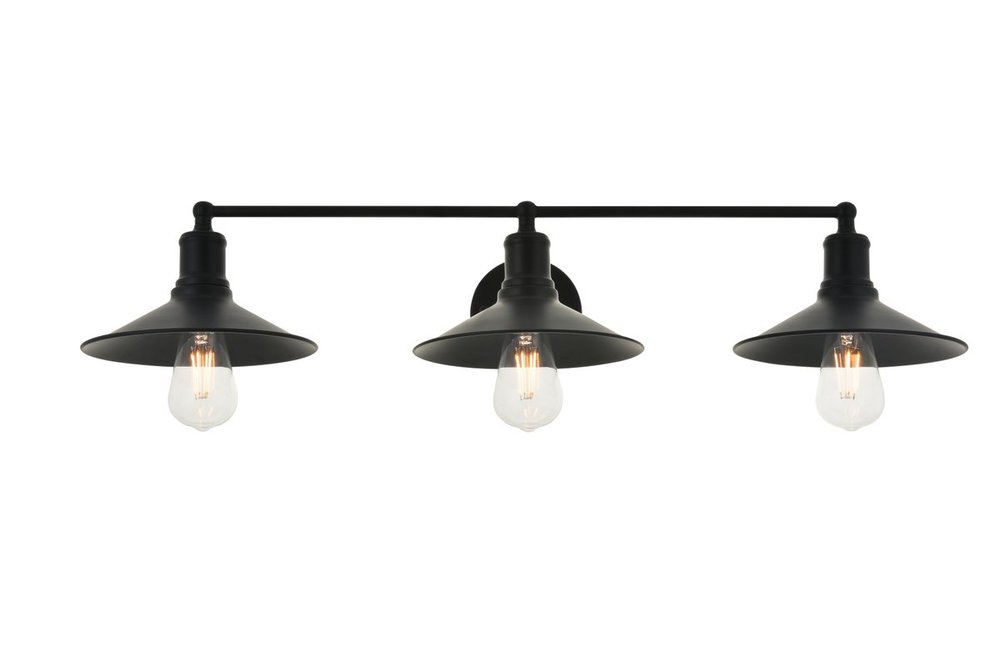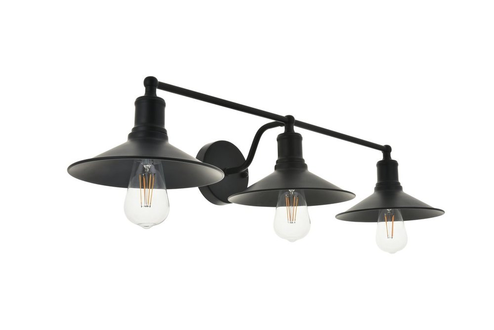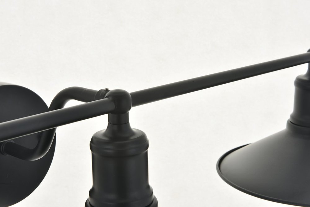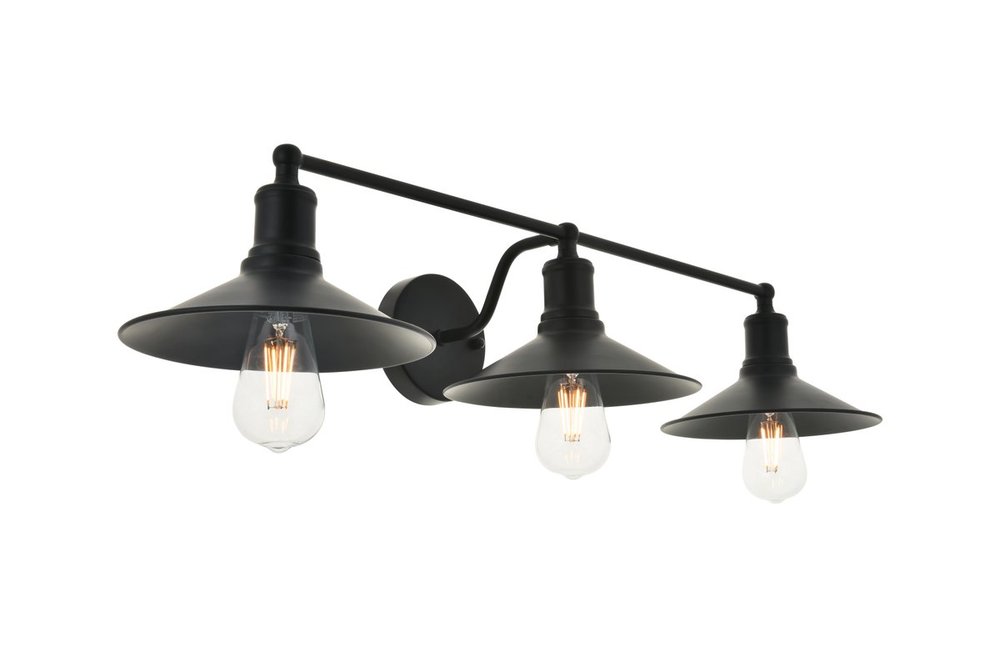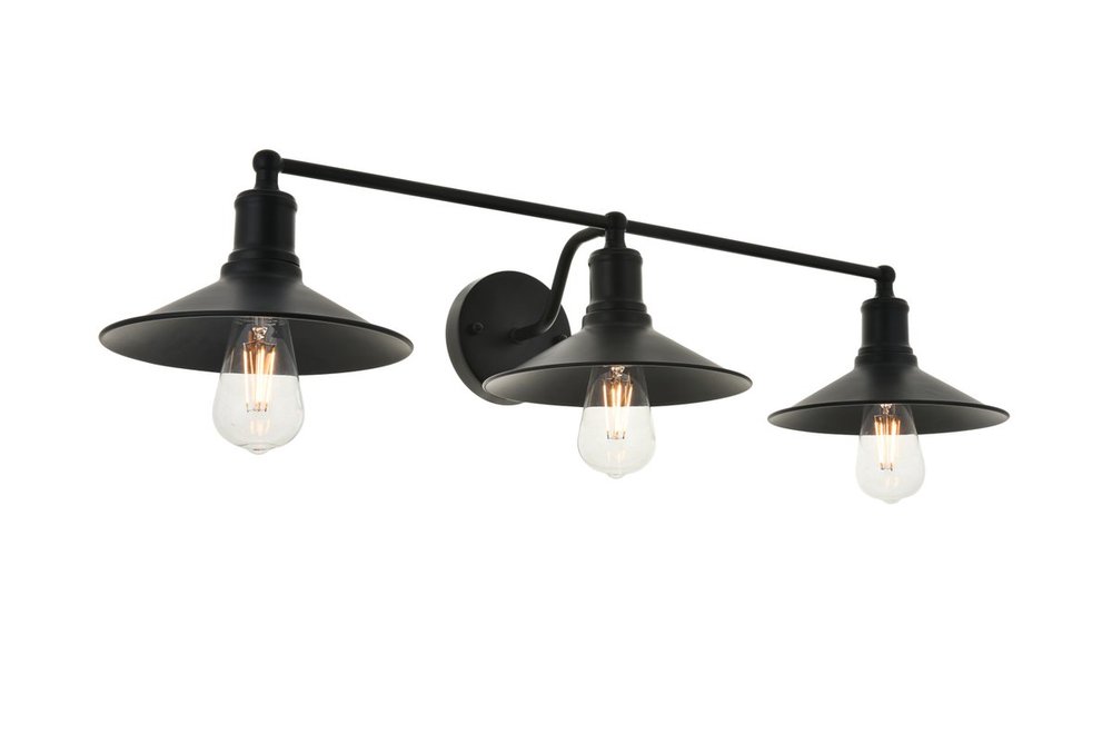 Black finish 3-light wall sconce with a curved arm and cone shaped shade