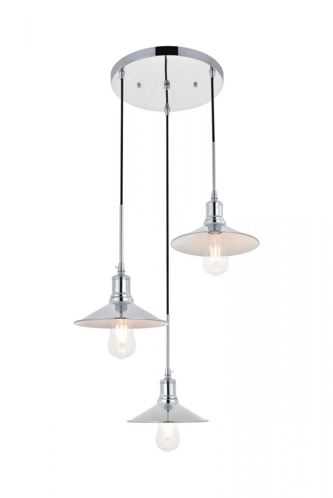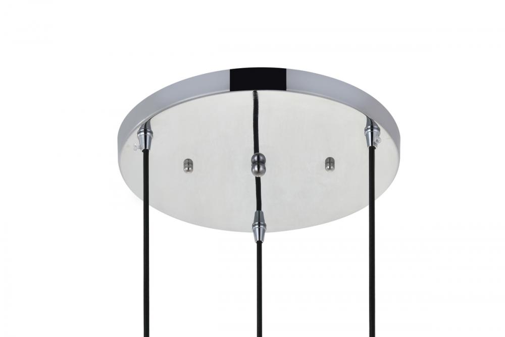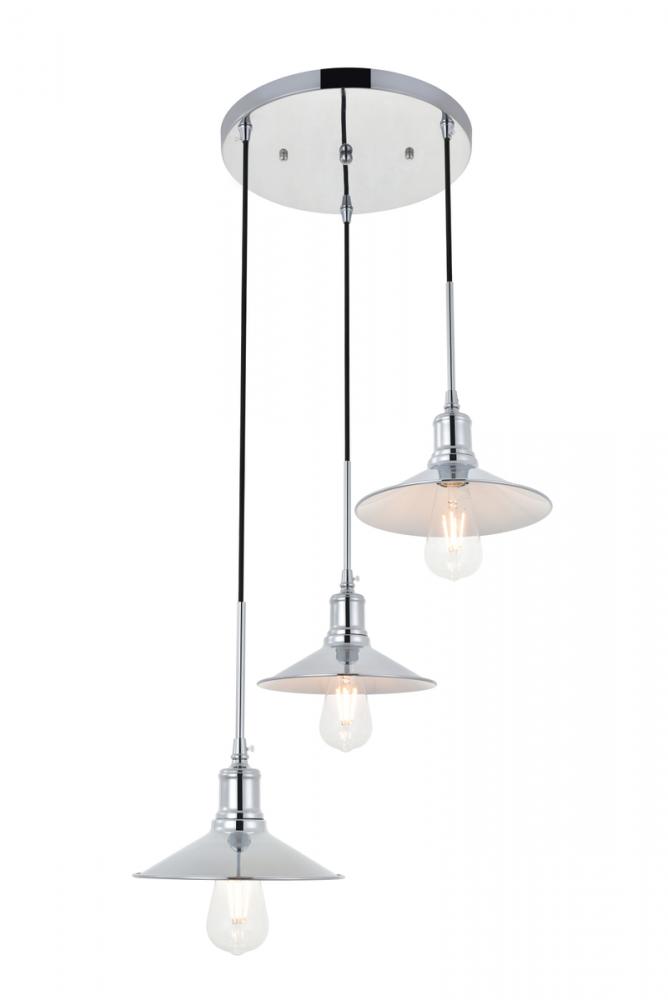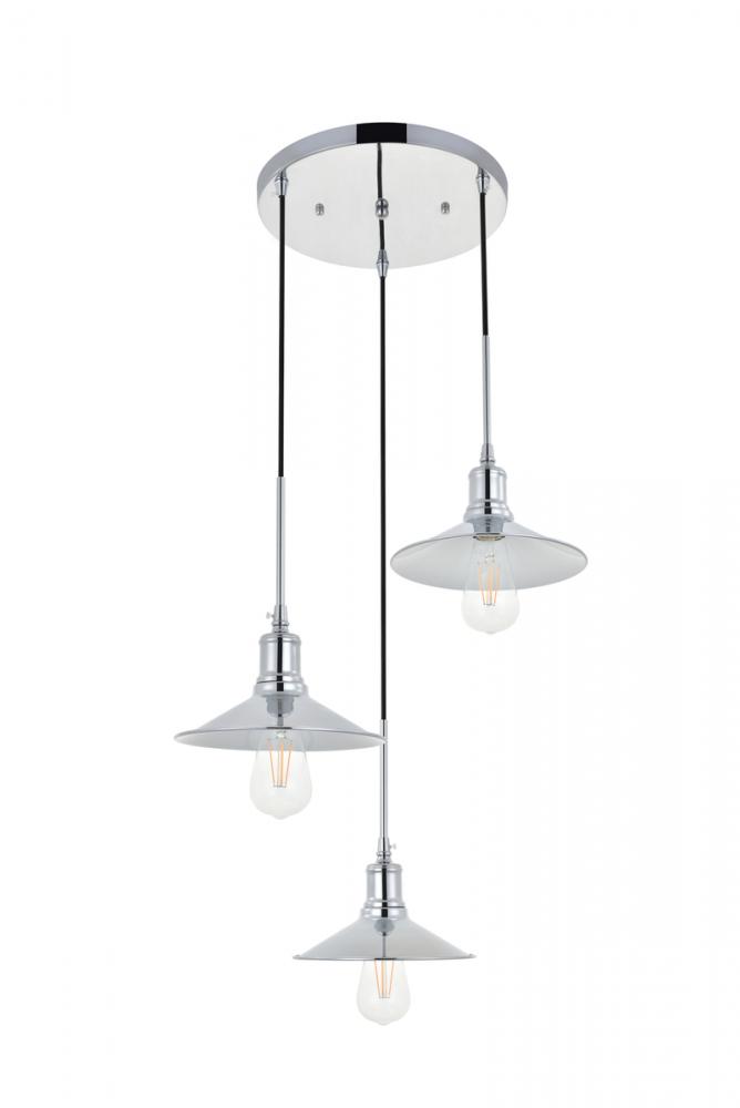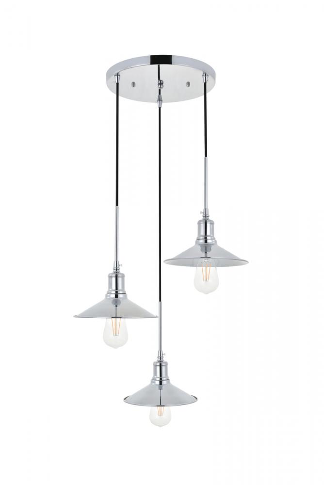 Chrome finish 3-light pendant light with dome shaped shade suspended from a circular canopy