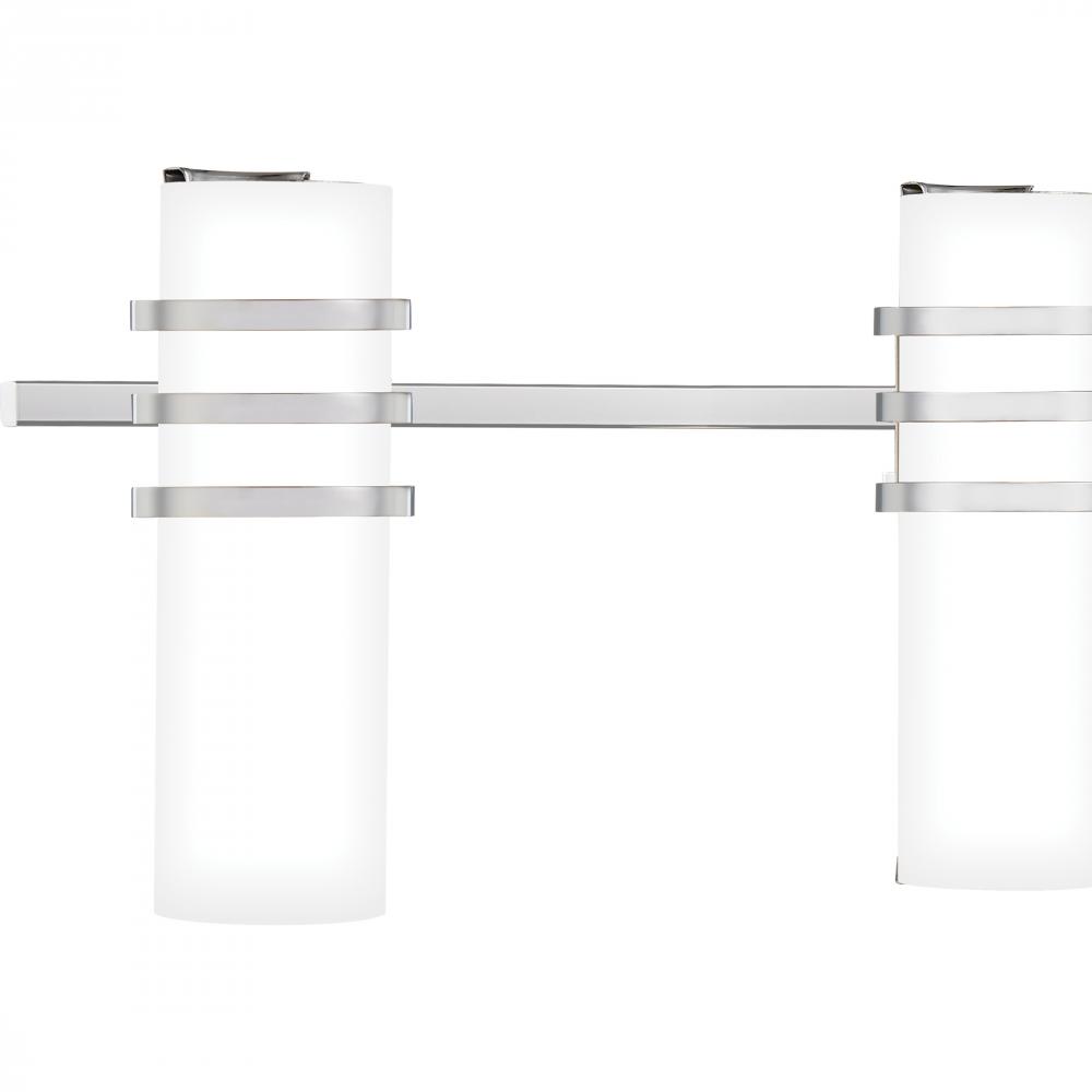 Give your bathroom a fresh look with the Everhart collection. This modern style fixture comes in a Polished Chrome finish with etched white painted glass shades. Banded details and a simple silhouette allow it to complement a variety of bathroom styles.
