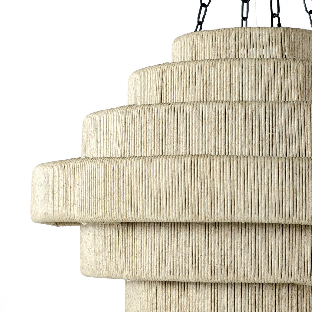 All-weather synthetic abaca in a natural oatmeal color is finely wrapped around a powder coated metal frame for maximum durability. Pendant comes with a matte black finished chain and canopy hanging kit. Suitable for covered outdoor use in a damp location