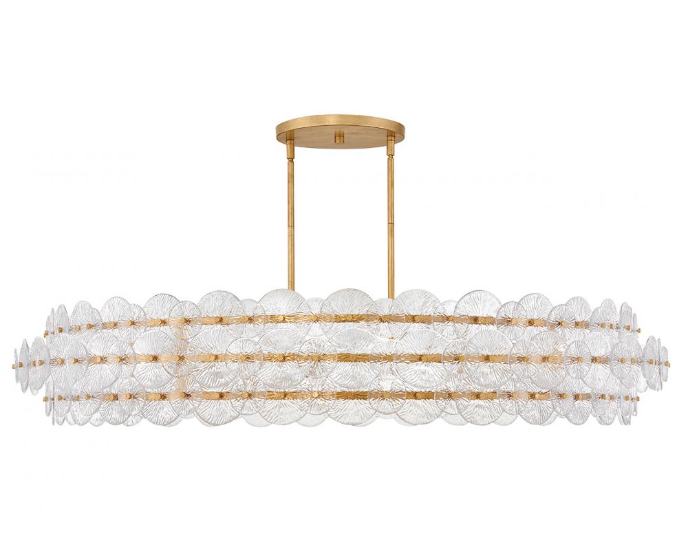 Rene radiates light through multiple layers of beautiful, pressed glass disks. Rene’s signature touch highlights a Distressed Brass finish, evoking both transitional and glam influences.