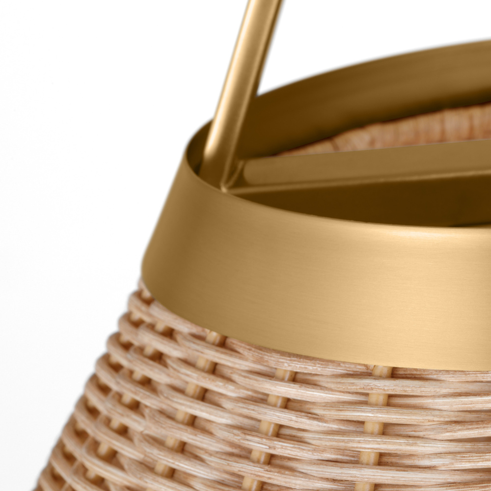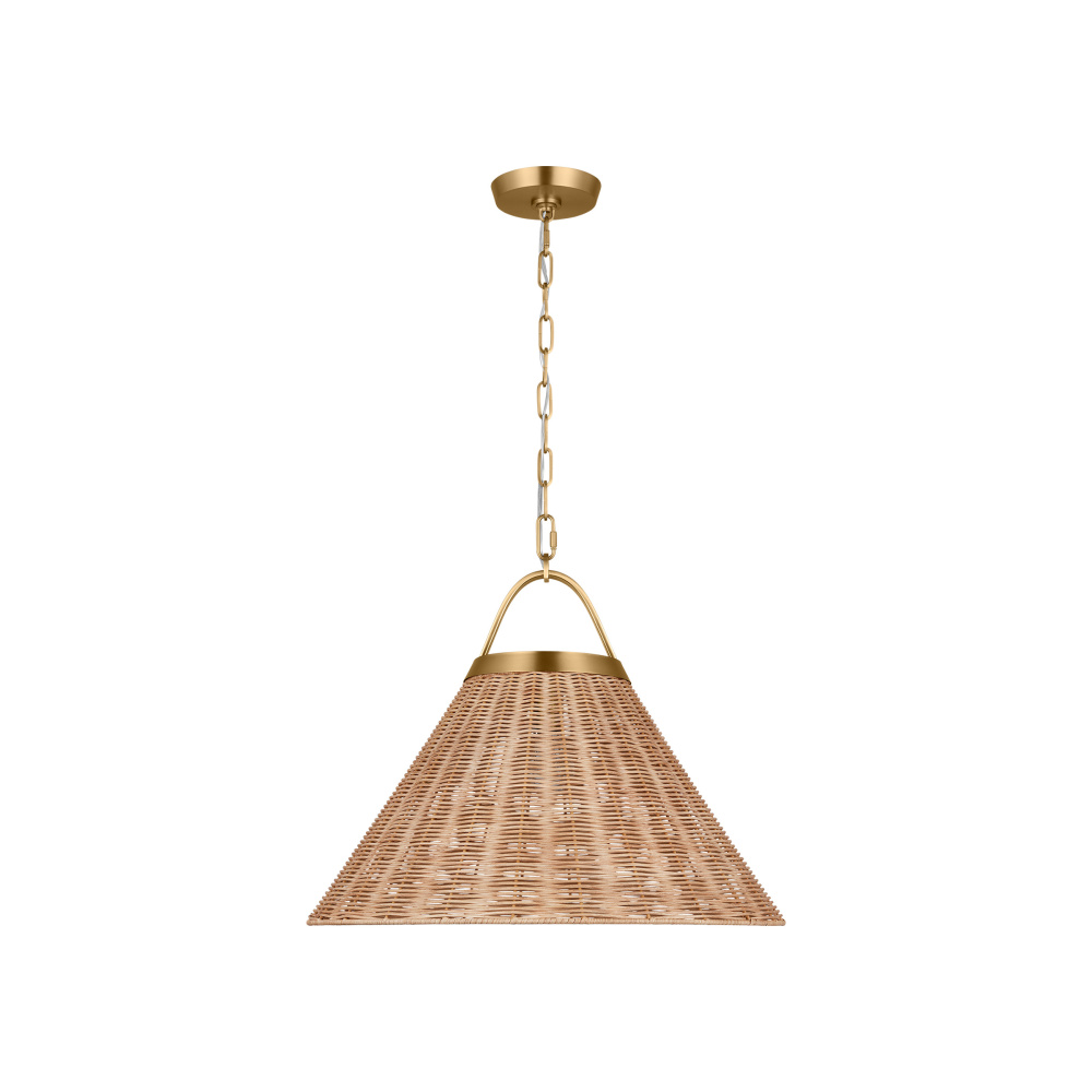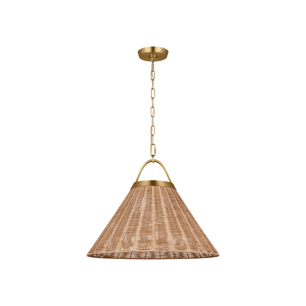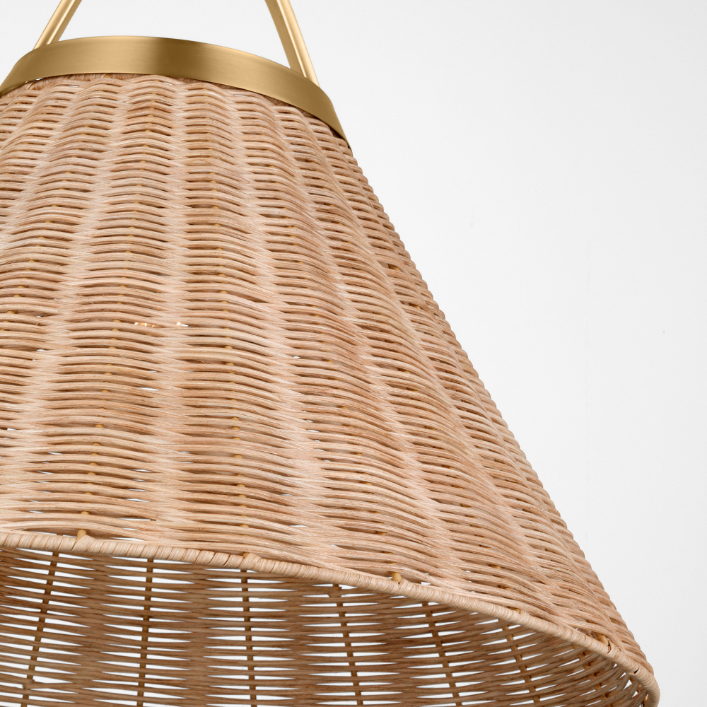 Handwoven with natural rattan, Whitby adds a beautiful texture to your home. The natural woven conical shades are mounted to an elegant circular metal cuff with an arched yoke suspended from the metal chain. The wire is hidden within the arched yoke giving a clean appearance to the overall form. Whitby works well in a group above a dining table or kitchen island, by itself, or in any room that could use a casual touch.