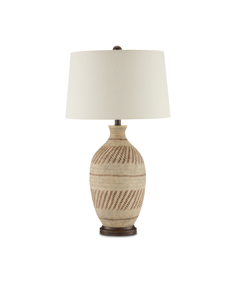 The earthen basket-weave texture of the Faiyum Table Lamp enlivens its classic pottery form to make it appear it is a wrapped confection of texture. The effect is created then the terracotta is glazed in tan and brown hues to hint at a woven pattern. The hand-rubbed bronze hardware and the flax linen shade blend perfectly with the tones in the lamp, which stands 31 inches tall.
