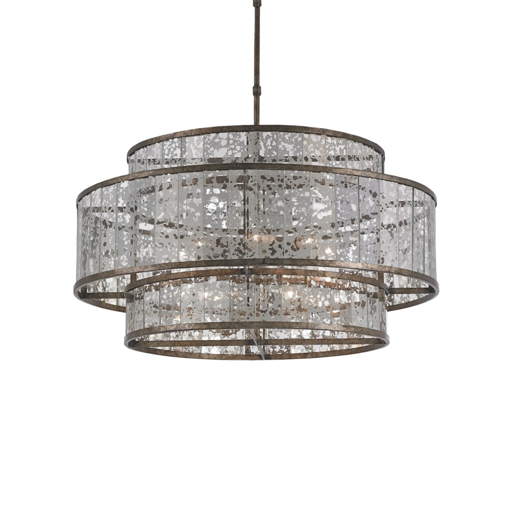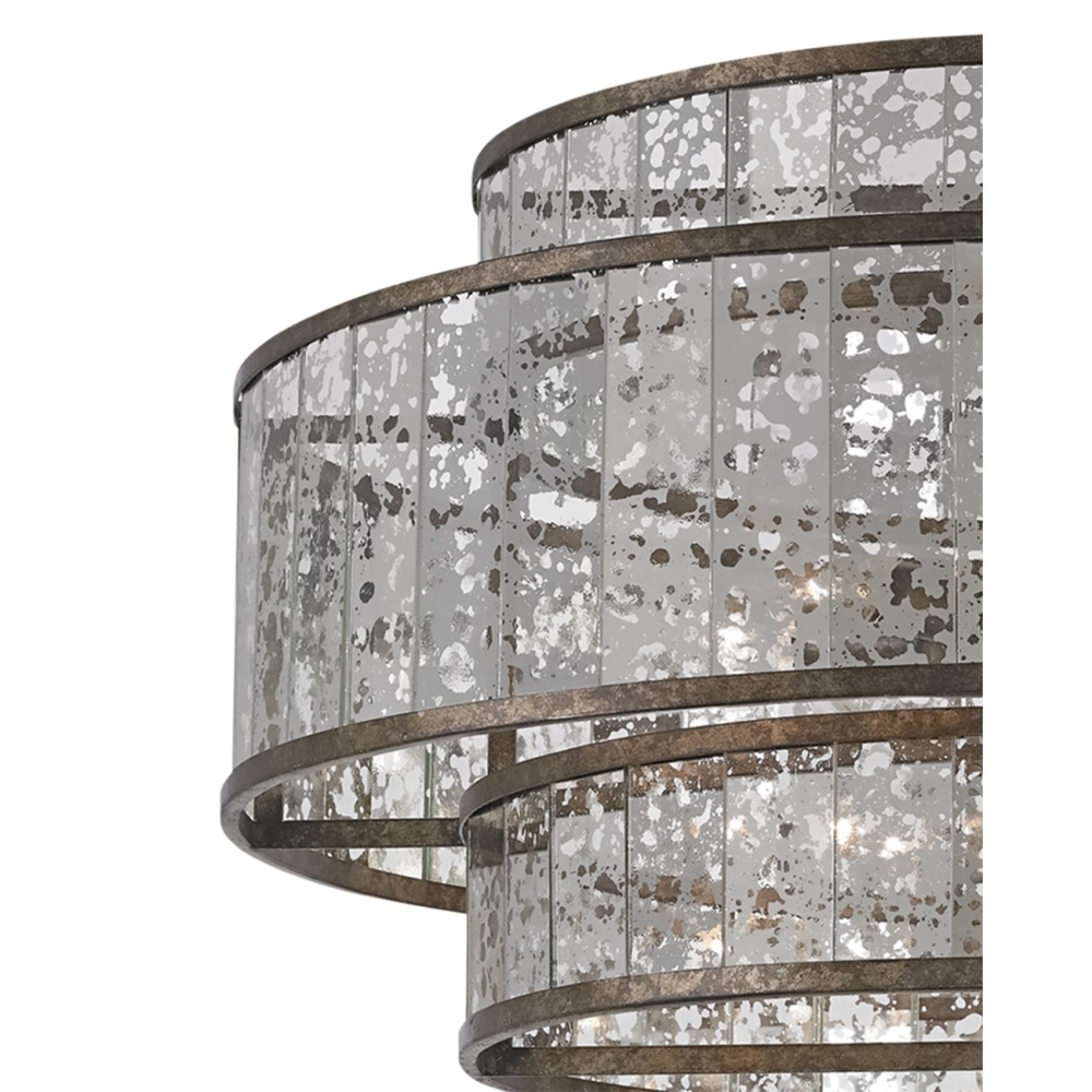 The Fantine Large Chandelier has shades made of Raj mirror that strikingly resemble mercury glass. The Pyrite bronze finish on the metal of this mirrored chandelier echoes the mottled tones in the glass to create synchronicity. The Fantine is also available in a small chandelier and a wall sconce. Adjustable from 25" to 54" with use of included chain/rod kit/cable. If your space calls for a longer drop, additional chain/rods/cable is available for purchase.