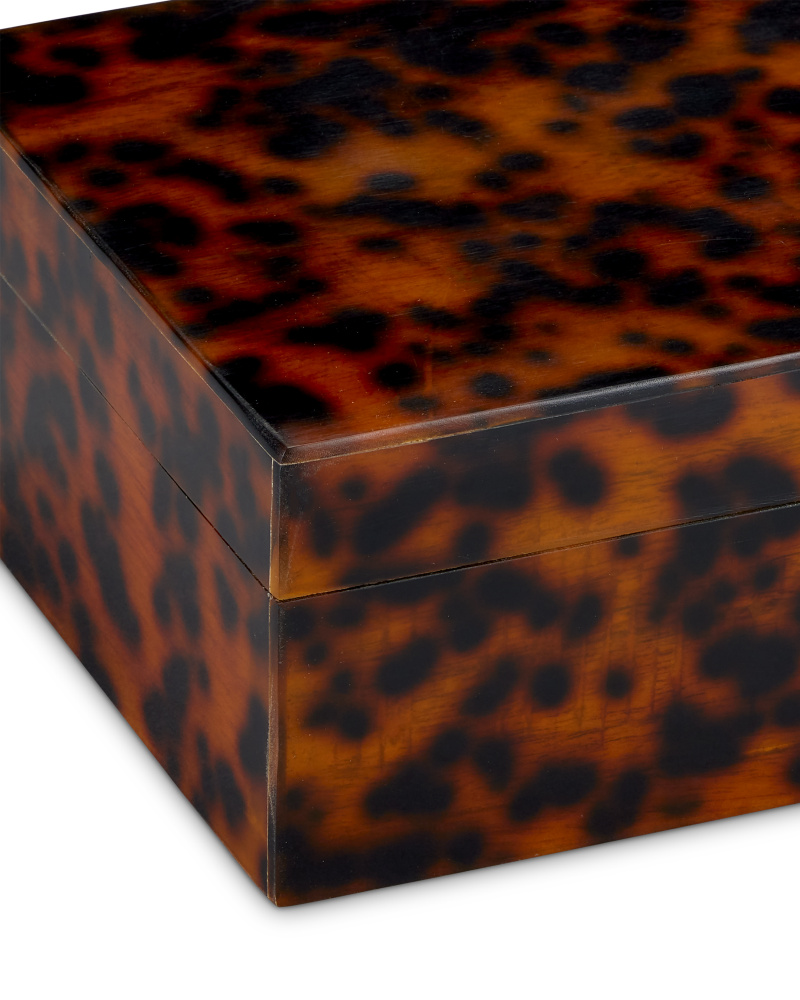 The Faux Tortoise Box Set is made of black and brown mottled composite. The chic pattern has been popular in interiors for centuries, which makes these brown decorative boxes timeless. Adding interest and texture to a room, tortoiseshell acts as a neutral, so it works with any color scheme and every design style from modern to traditional. These boxes will be durable because they have solid wood interiors.