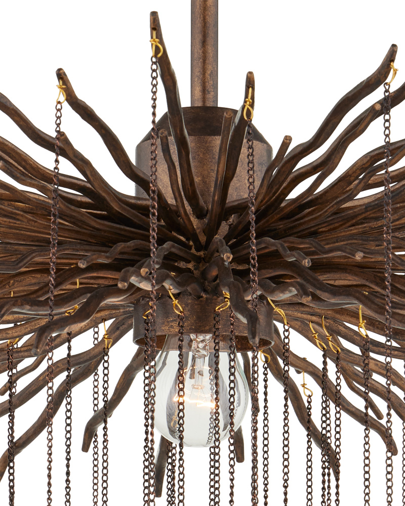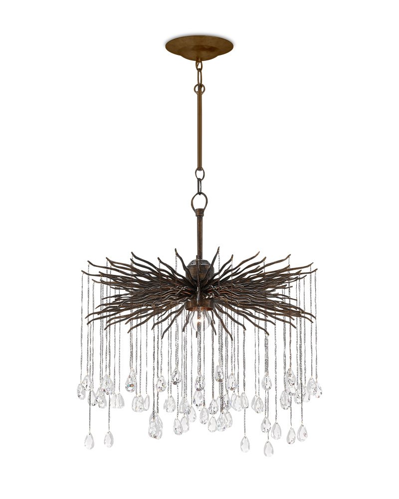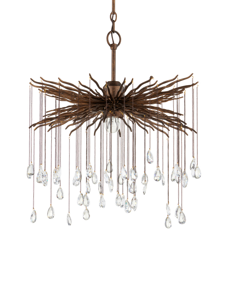 The Fen Small Chandelier is made of wrought iron limbs that stretch outward like gnarled branches. Each one supports a delicate chain adorned with a single crystal. The brutalist design of this bronze chandelier is heightened by the Cupertino finish. Adjustable from 30" to 97" with use of included chain/rod kit/cable. If your space calls for a longer drop, additional chain/rods/cable is available for purchase.