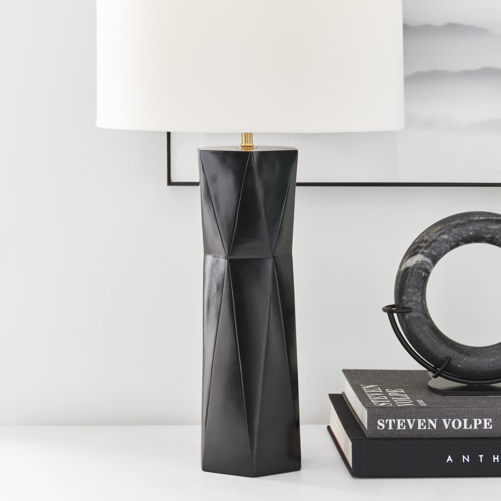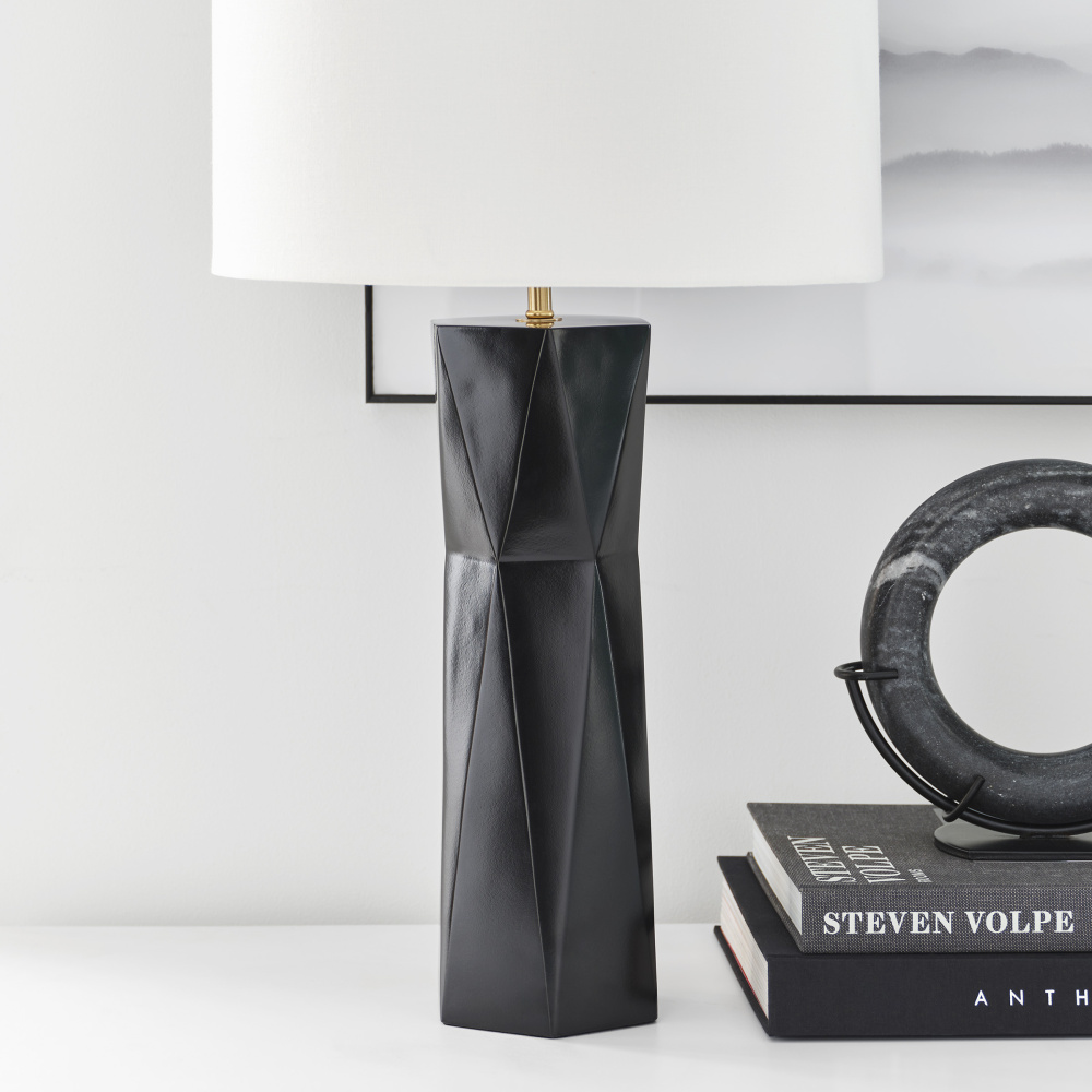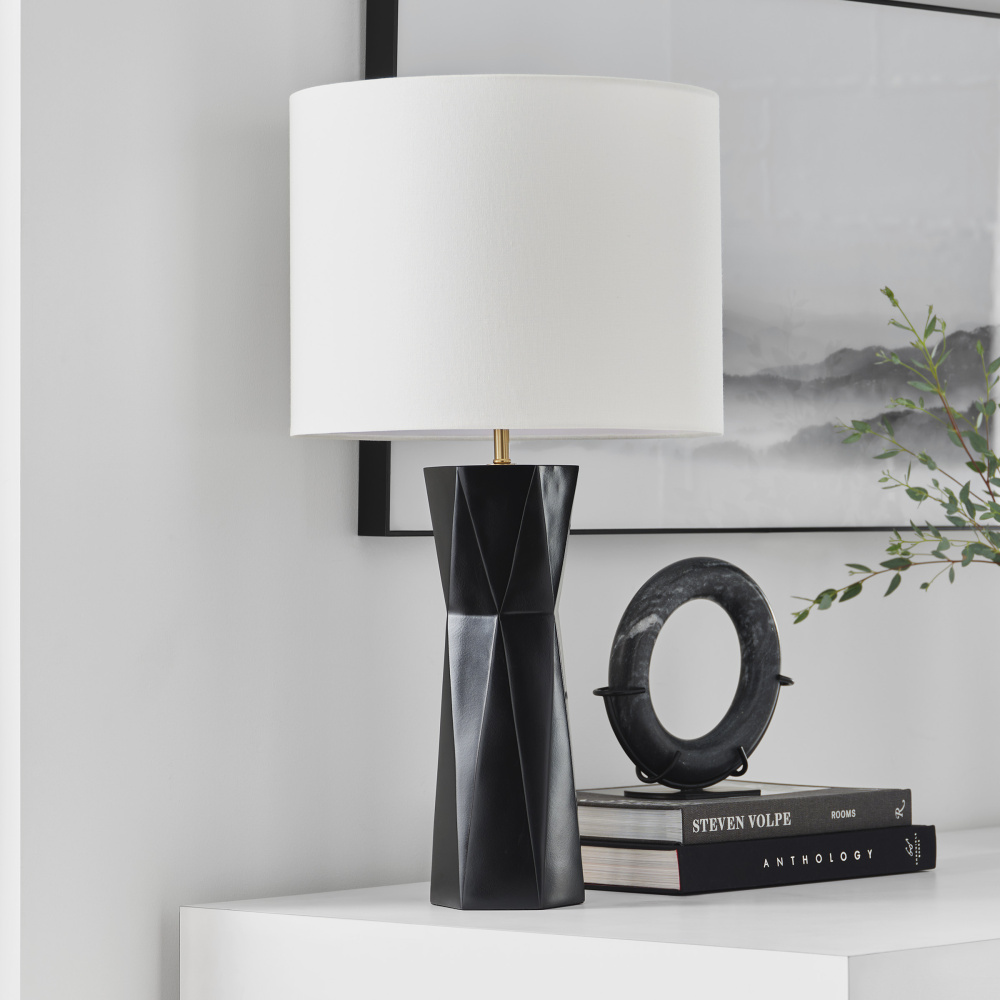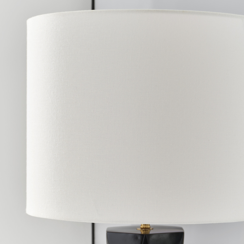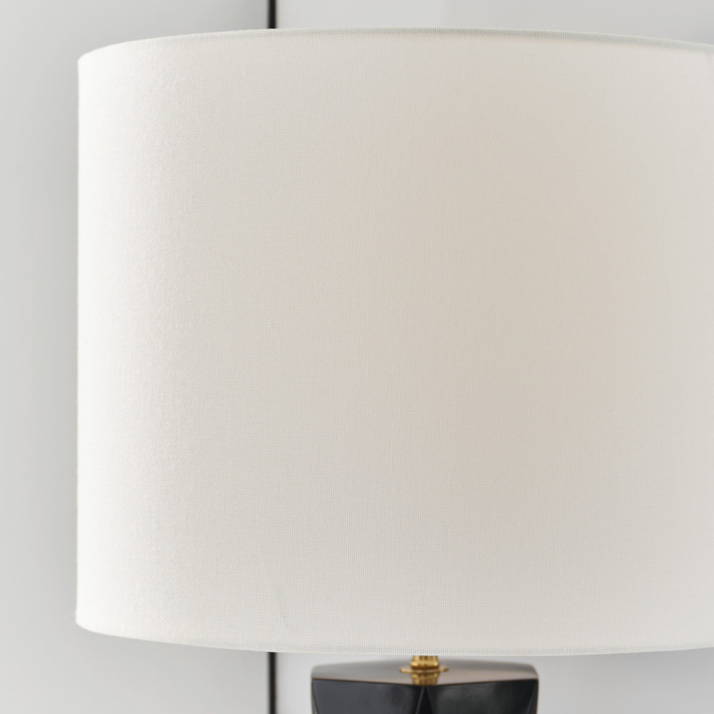 Fernwood is a multifaceted column table lamp in rich tones that gives visual dimension to a mid-century look, adding a refined modern note to your space. It features a square base with a gleaming gold finish crafted from resin, and it showcases a textured design for an Art Deco appeal. Fernwood is capped with a white line shade dispersing light from a medium-base bulb (included).