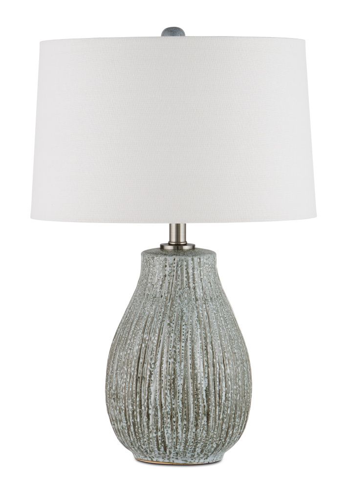 The reactive black and white glaze on the surface of the Fidella Table Lamp is only one of the facets of this design that brings it a jaw-dropping texture. The bubbles that are inherent in artisanal glazing and the striations carved into the body of the ceramic lamp also contribute to the patina. The finial that matches the pear-shaped body's color and fastens the drum shade to the gray lamp completes this interesting composition.