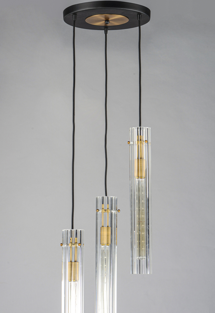 Dramatic and opulent, light sources shine through exquisite Clear scalloped glass hurricane shades as they seemingly float on unique metal prongs finished in Antique Brass. The brass accents are contrasted with a Black frame configured in cascading pendant