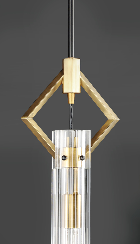 Dramatic and opulent, light sources shine through exquisite Clear scalloped glass hurricane shades as they seemingly float on unique metal prongs finished in Antique Brass. The brass accents are contrasted with a Black frame configured in cascading pendant
