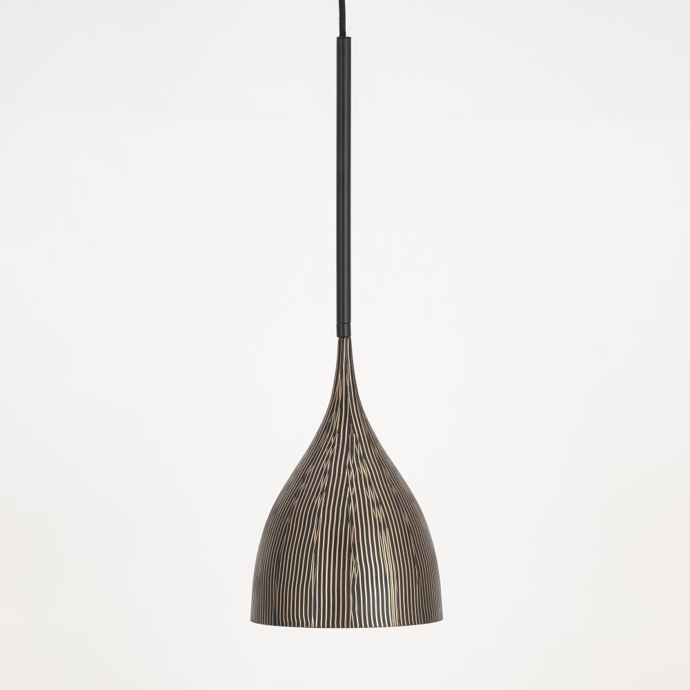 Graceful and sculptural, Fleur's gently flared silhouette brings a sense of quiet sophistication to any space. Hand-spun metal shades are adorned with a striated finish, scraped by hand to reveal glowing Gold undertones beneath layers of Matte Black or