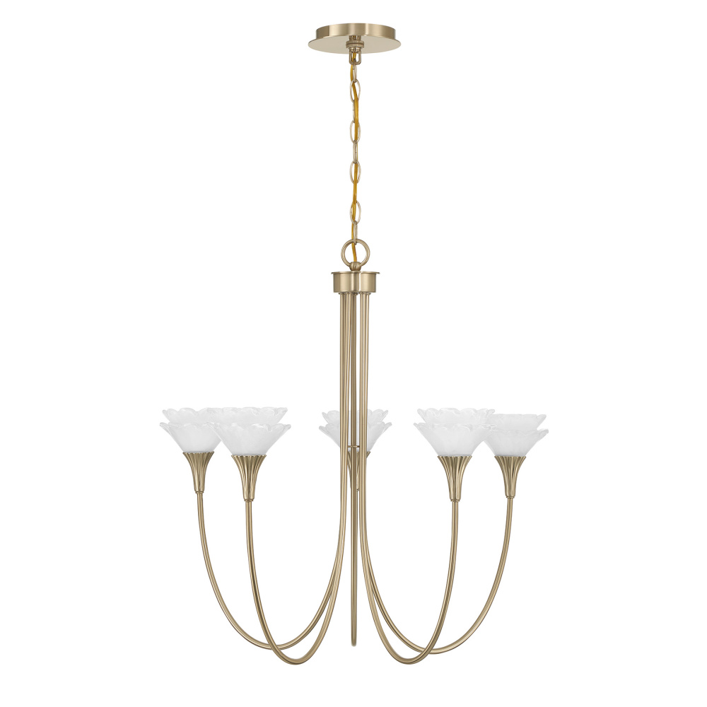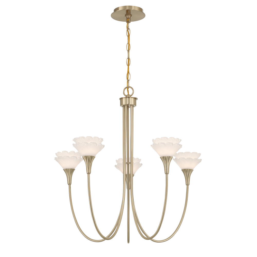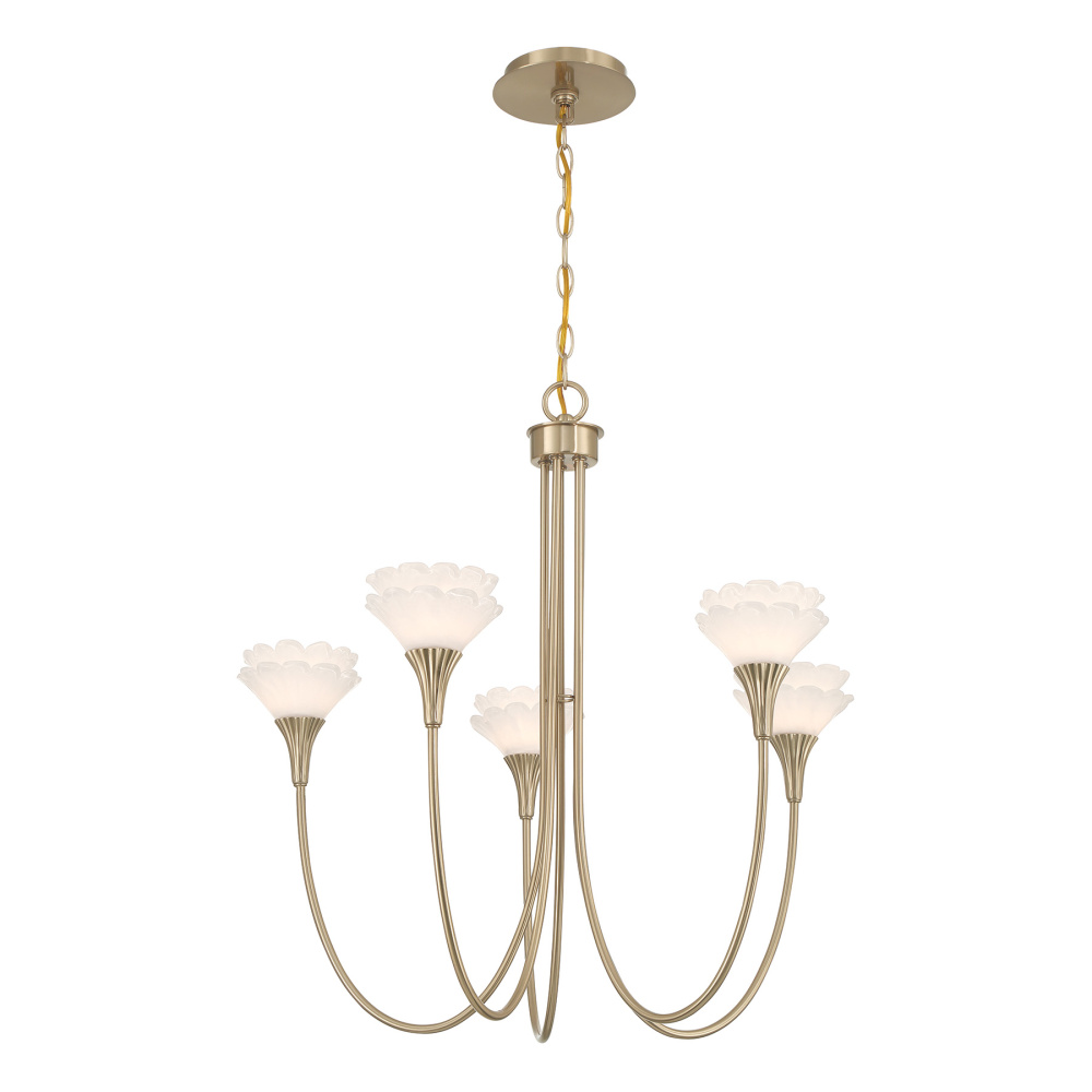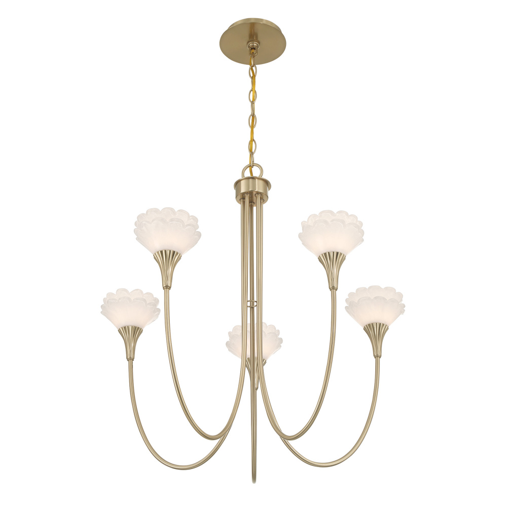 Designed by award-winning interior designer and TV host Breegan Jane, the Savoy House Florena 5-light chandelier transforms a room with its sculptural botanical artistry. Five gently curved arms cradle blossoming pairs of handmade pearlescent white glass flowers, creating a chandelier that feels delicate yet immensely expressive. The Noble Brass finish enriches the glow, bringing warmth and refinement. Florena is 26" in height and 26" in width. It uses five G9 bulbs of up to 60 watts per bulb. Bulbs not included. Comes with 120" of chain.