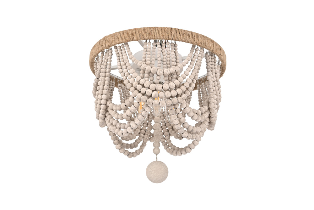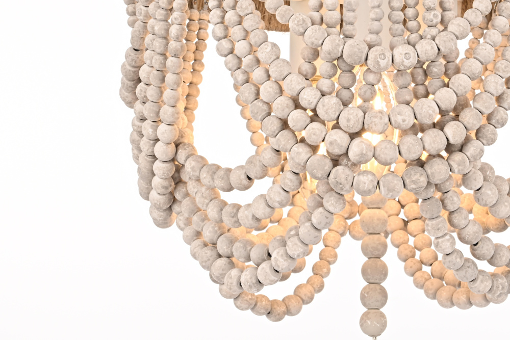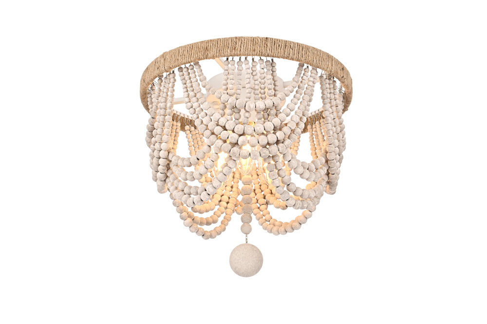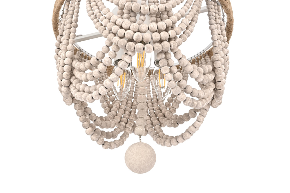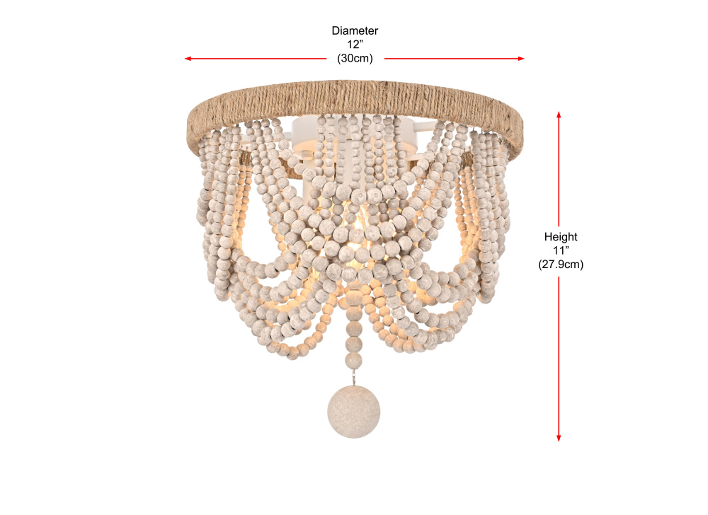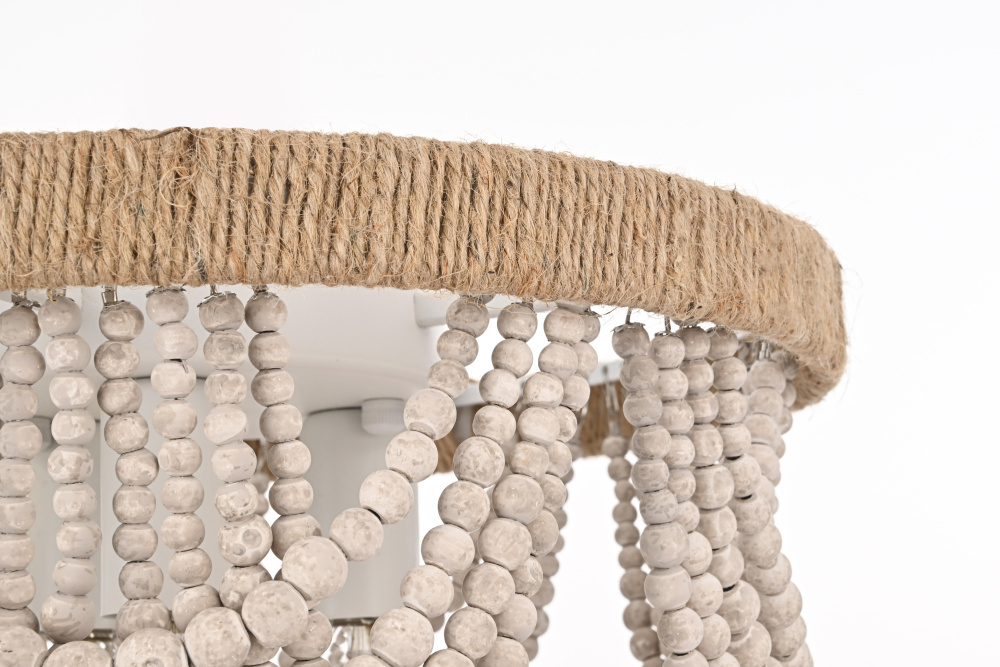 Transform your ceiling with this extraordinary semi-flush mount that reimagines traditional beaded chandelier design for modern spaces. The ingenious combination of a rope-wrapped crown and meticulously arranged wooden bead swags creates a stunning interplay of texture and form. Each tier of beads is thoughtfully positioned to create graceful scallops that catch and filter light in captivating ways. The substantial wooden finial anchors the design while adding an extra touch of artisanal beauty. Perfect for spaces where a traditional chandelier might overwhelm, this fixture brings all the drama of suspended beadwork while maintaining a practical ceiling-hugging profile. The iron framework provides sturdy support while remaining discreet, allowing the natural beauty of the wooden beads to take center stage. Whether styled in sophisticated antique white or warm natural beige, this fixture adds instant character to dining rooms, bedrooms, or entryways. The thoughtful blend of materials and textures creates a piece that feels both timeless and fresh, making it an ideal choice for designers and homeowners seeking to create a space with authentic charm and artistic presence.