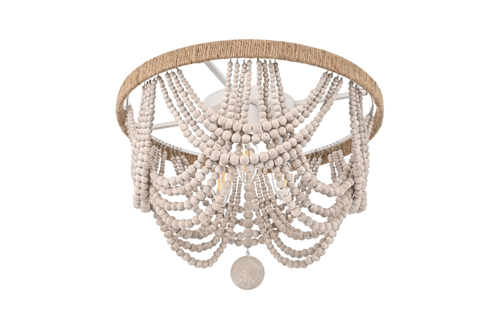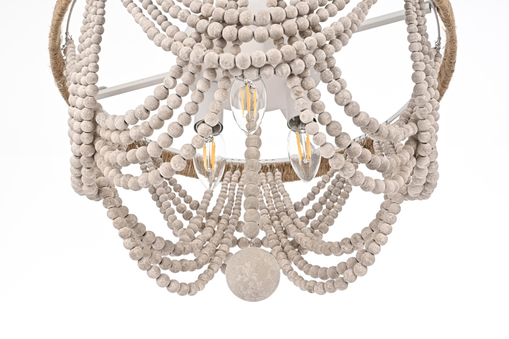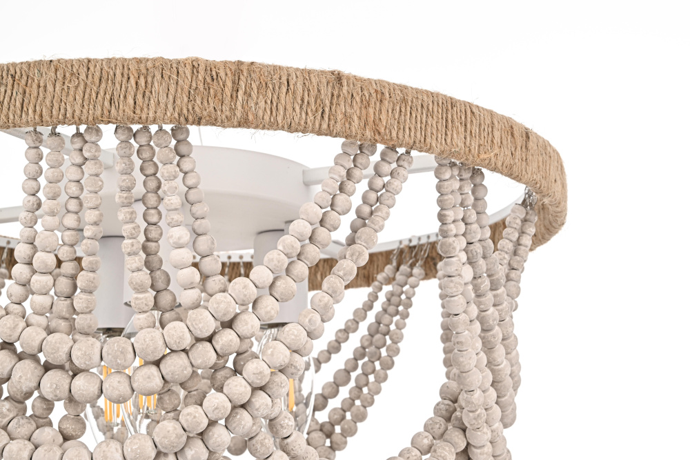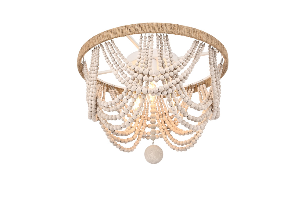 Transform your ceiling with this extraordinary semi-flush mount that reimagines traditional beaded chandelier design for modern spaces. The ingenious combination of a rope-wrapped crown and meticulously arranged wooden bead swags creates a stunning interplay of texture and form. Each tier of beads is thoughtfully positioned to create graceful scallops that catch and filter light in captivating ways. The substantial wooden finial anchors the design while adding an extra touch of artisanal beauty. Perfect for spaces where a traditional chandelier might overwhelm, this fixture brings all the drama of suspended beadwork while maintaining a practical ceiling-hugging profile. The iron framework provides sturdy support while remaining discreet, allowing the natural beauty of the wooden beads to take center stage. Whether styled in sophisticated antique white or warm natural beige, this fixture adds instant character to dining rooms, bedrooms, or entryways. The thoughtful blend of materials and textures creates a piece that feels both timeless and fresh, making it an ideal choice for designers and homeowners seeking to create a space with authentic charm and artistic presence.