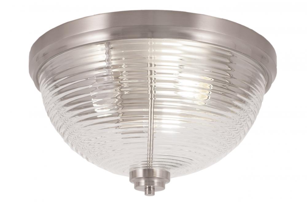 16 Flush Mount, 3-Bulbs, Shown In Brushed Nickel Finish With With Clear Ribbed Glass