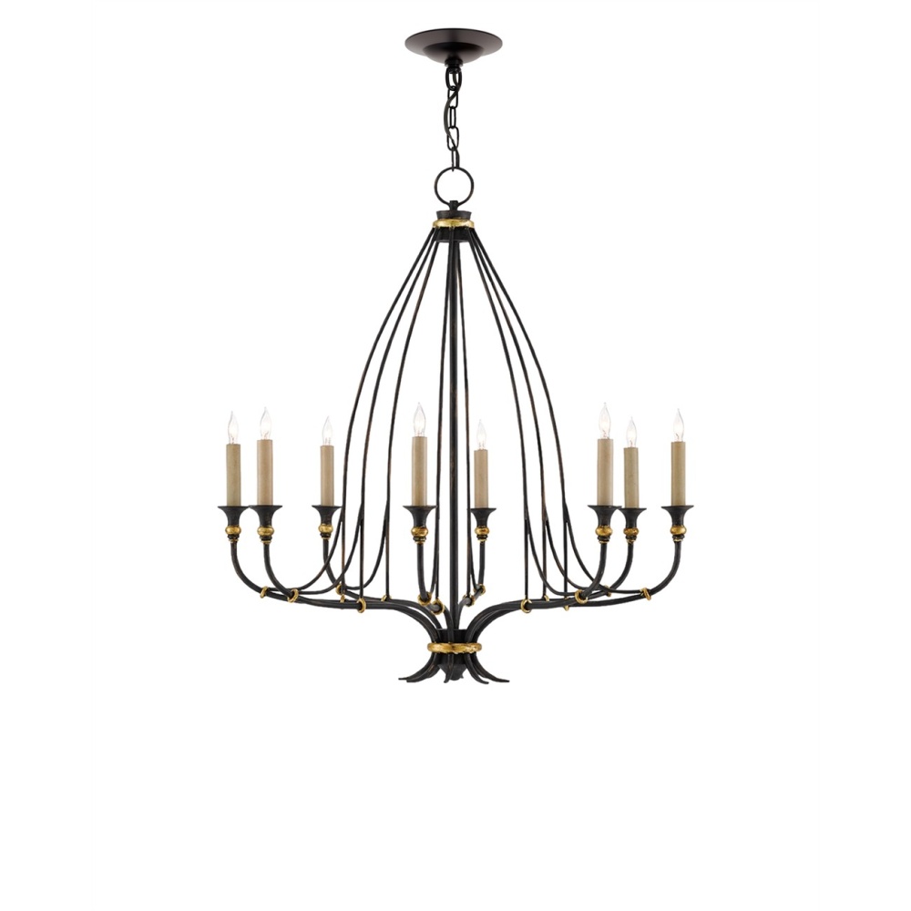 Not quite as sweeping as the larger fixture of the same name, the small version of the Folgate Chandelier has the same open form based upon influences as diverse as the frankness of the Federal style and the fluidity of French neoclassicism. The illumination flowing from the eight-light fixture will stir the air over a dining room table or a in a foyer. The wrought iron on the piece has been treated to a French black finish enlivened by gold leaf accents.