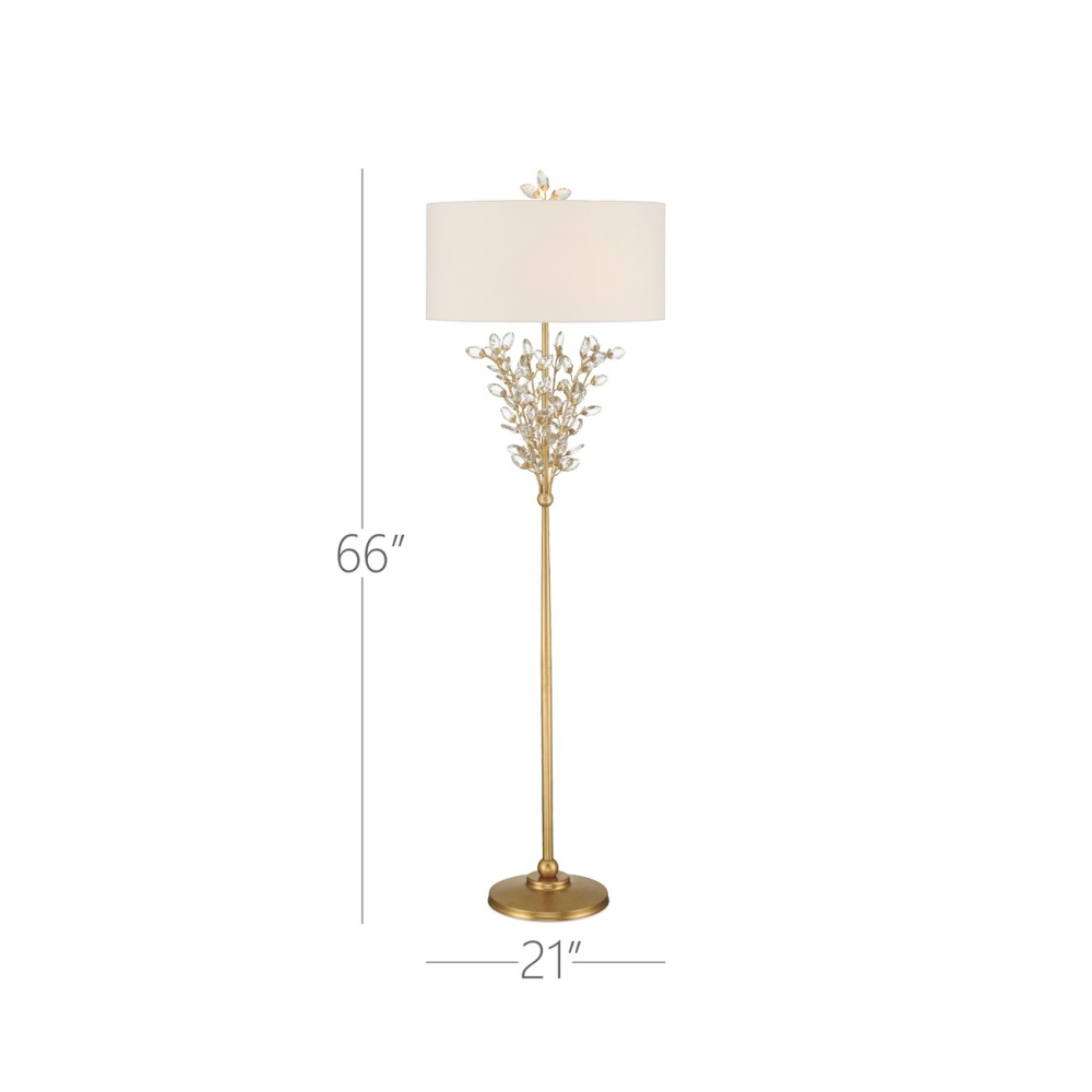 The Forget-Me-Not Gold Floor Lamp has sparkling floral accents with flowing buds made of crystals. Contrasting the gold leaf finish, the sprays of crystal flow up from the thin stem to capture the illumination. The fixture is a functional piece and a work of art, as each crystal is hand-pinned. The reduced height of the drum shade, which is fastened to the fixture with a crystal finial, is an elegant touch for this two-light floor lamp.
