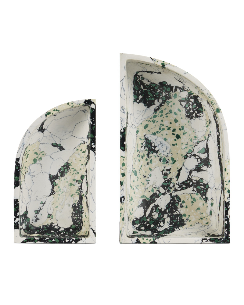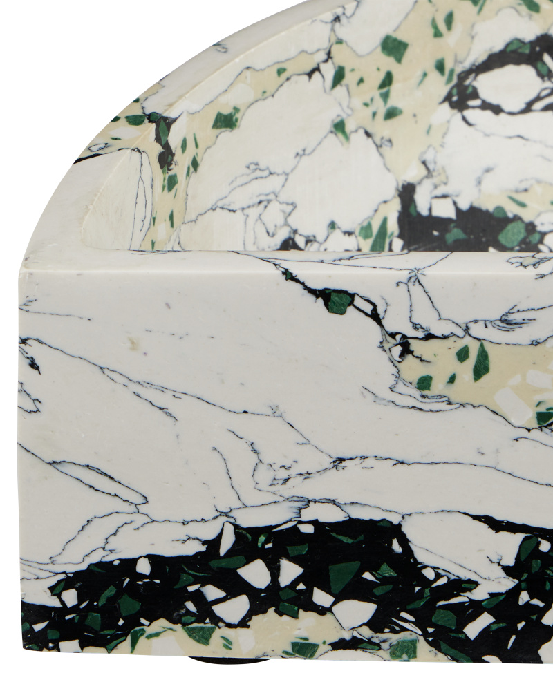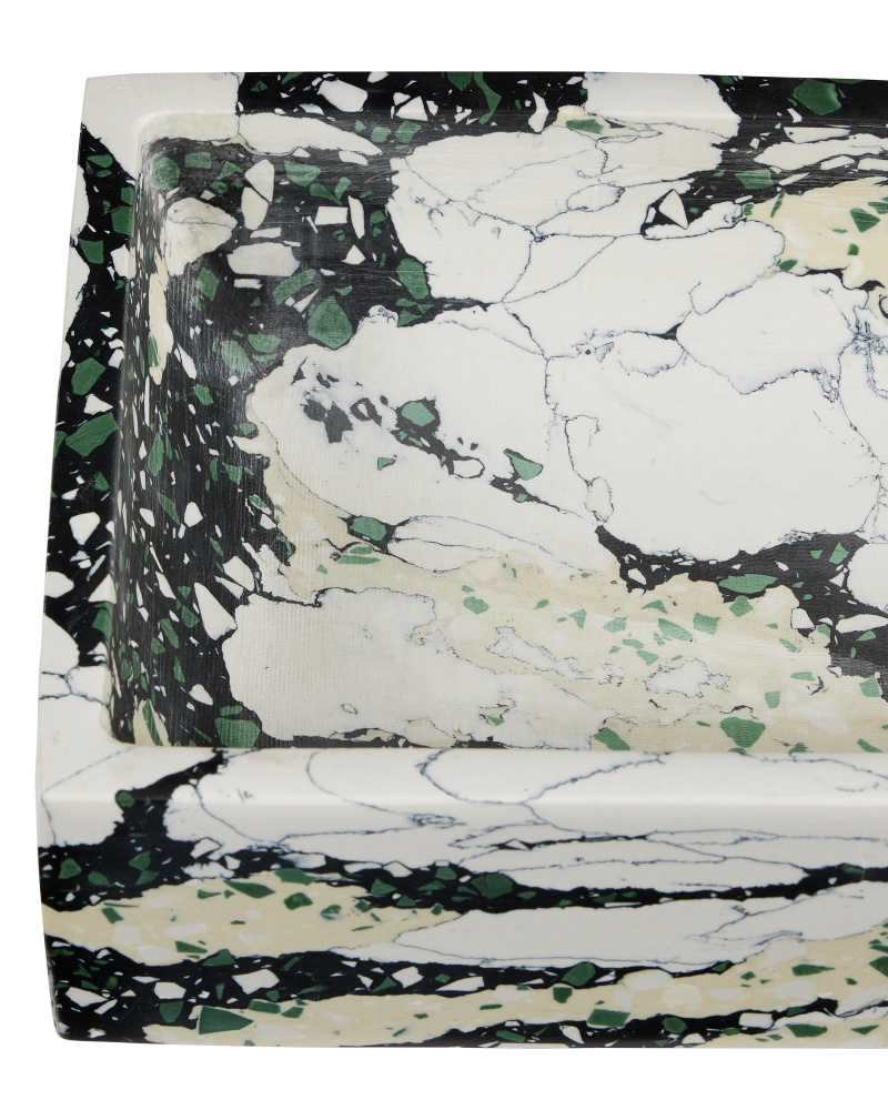 The Fossey Asymmetrical Tray looks like natural granite, but it's actually made of synthetic stone. The black and white decorative tray with hints of green and pale yellow has a swirling personality that makes it a textural accent. The one curved edge brings it an interesting profile.