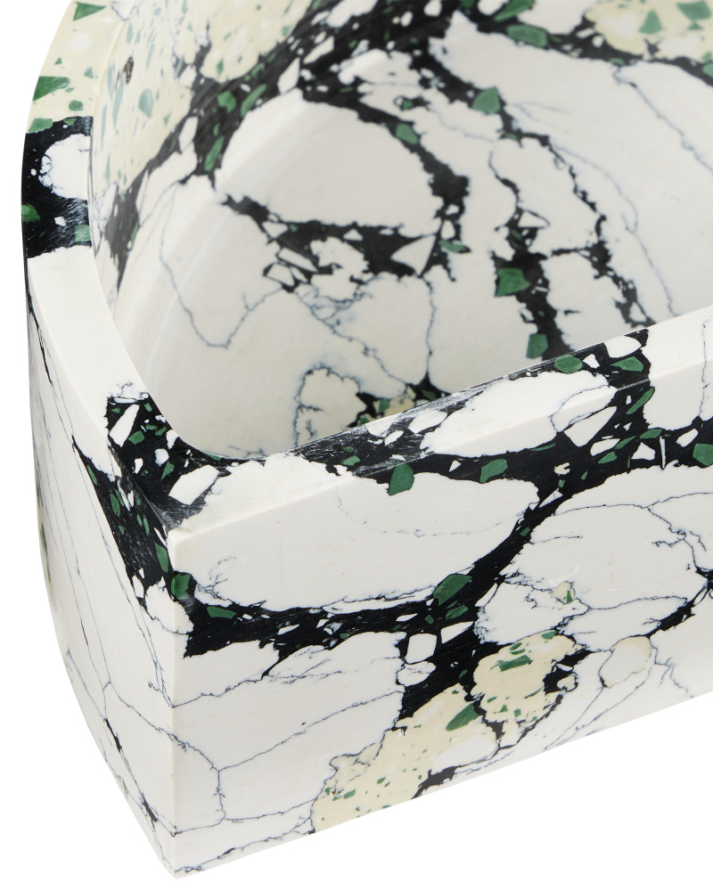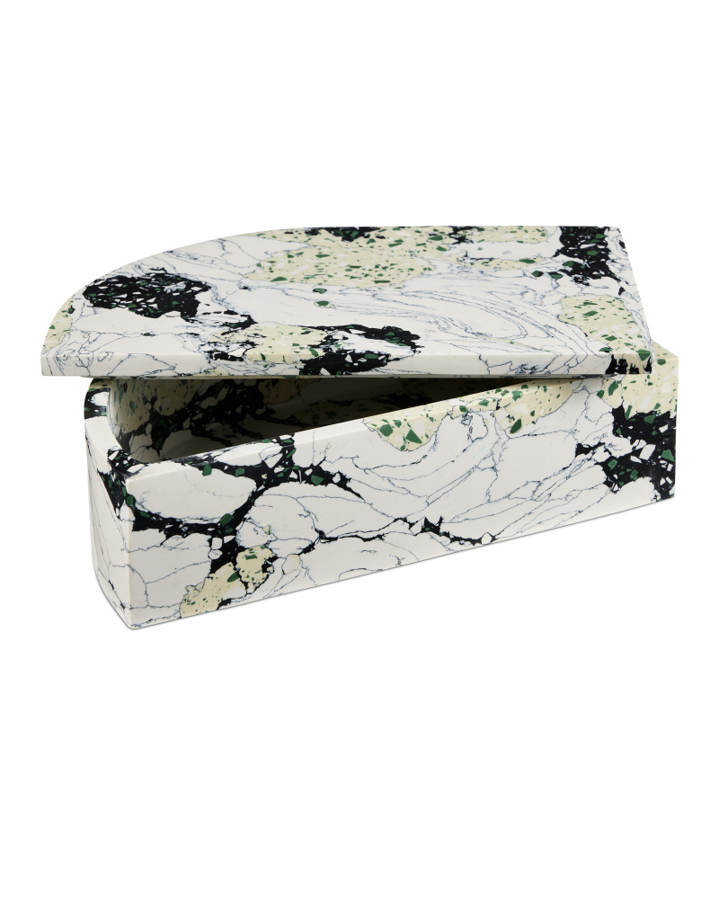 The Fossey Rectangular Box looks like natural granite, but it's actually made of synthetic stone. The black and white decorative box with hints of green and pale yellow has a swirling personality that makes it a textural accent. The one curved edge brings it an interesting profile.