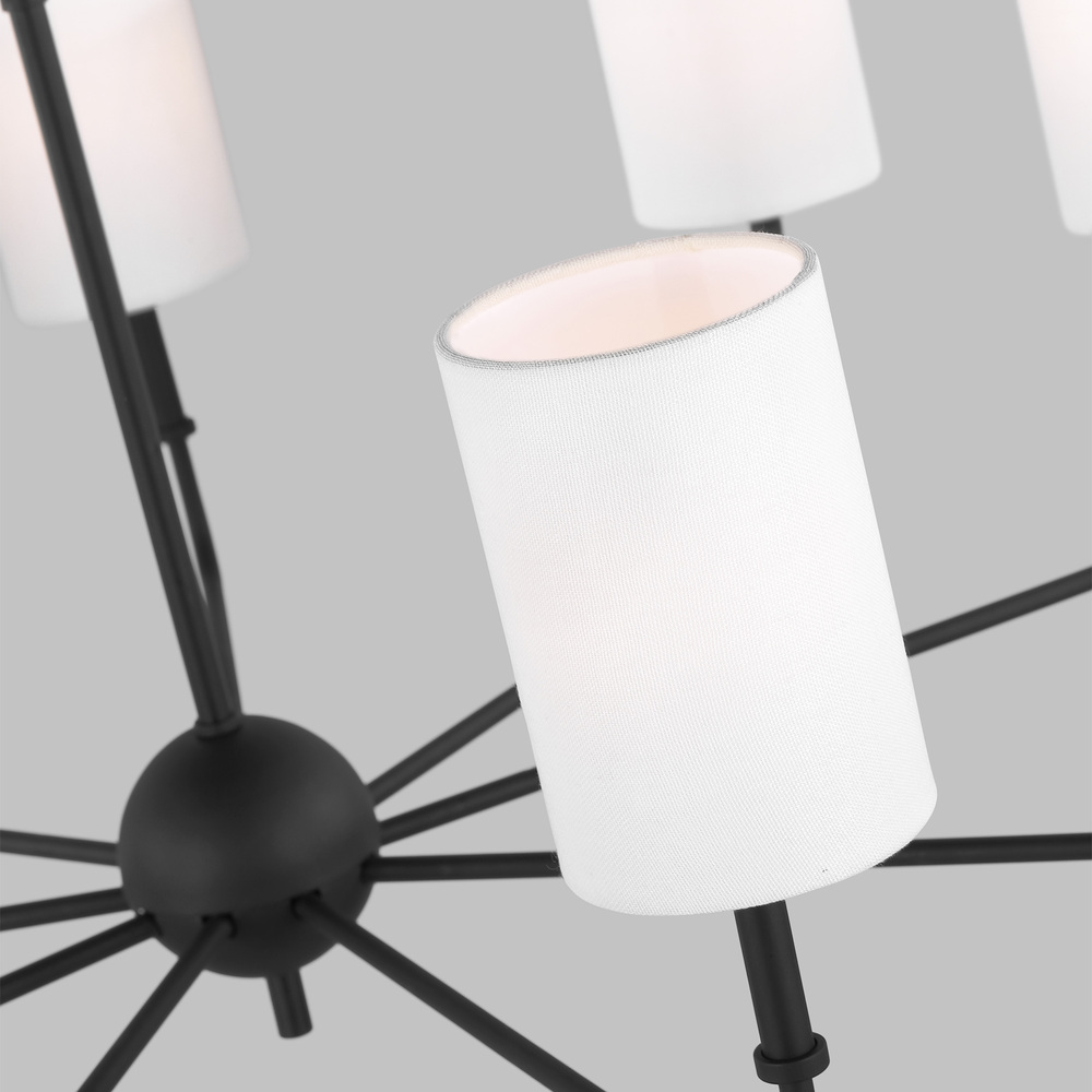 The Foxdale nine light single tier chandelier in Midnight Black encompasses the new traditional style with flawless execution. Refined and clean-lined, this classic silhouette is timeless without being stuffy. Perfectly transitional, this collection can be placed in any home regardless of style. Topped with White Linen Shades to complete the design.