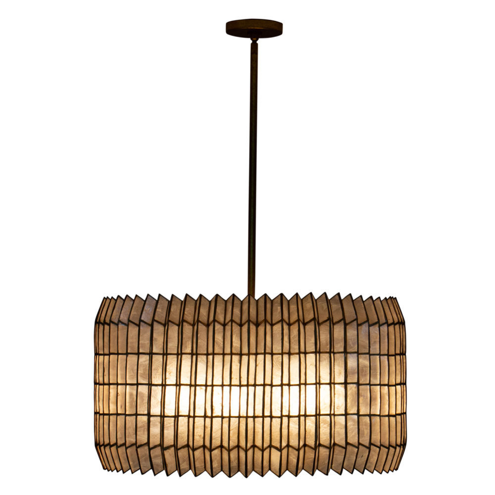 Drawing inspiration from origami, geometric designs, and the natural elegance of crystal cuts, the Fractal collection showcases a captivating zig-zag frame pattern mirrored in the capiz shade’s form. It emanates a gentle, warm glow that beautifully highlights its intricate design and understated shape. The piece is completed with a hand-applied Oxidized Gold Leaf (OL) finish, adding a touch of refined artistry.