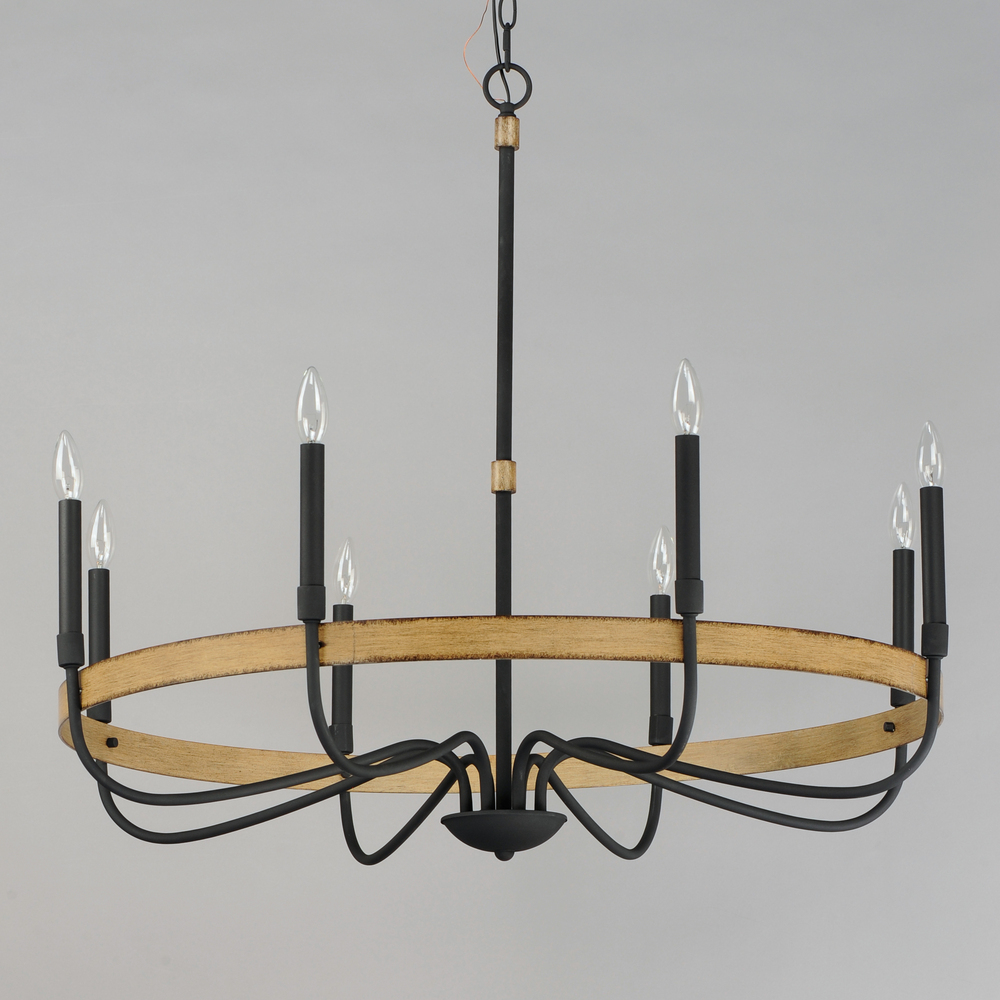 Rustic charm in an elegant, yet simple chandelier with warm distressed wood finishes and textured black metal arms. Black candle covers evoke wax candles to complete the classic and transitional appeal of this series. The flush mount features a satin white