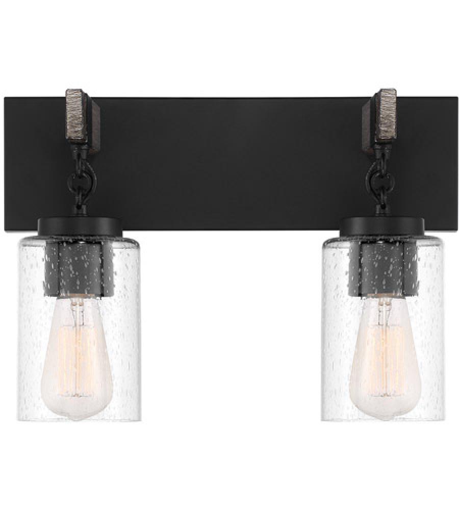 A rich Matte Black finish and blown clear Seedy Glass, accented with an Urban Slate Wood finish, make for a clean and sophisticated look in this Fulton vanity light. Used above a bath mirror, this piece is sure to enhance your decor while adding a touch of Modern Rustic appeal. It's easy to install and requires 2 screw-based light bulbs, ideal for filament style.