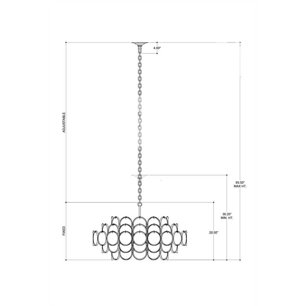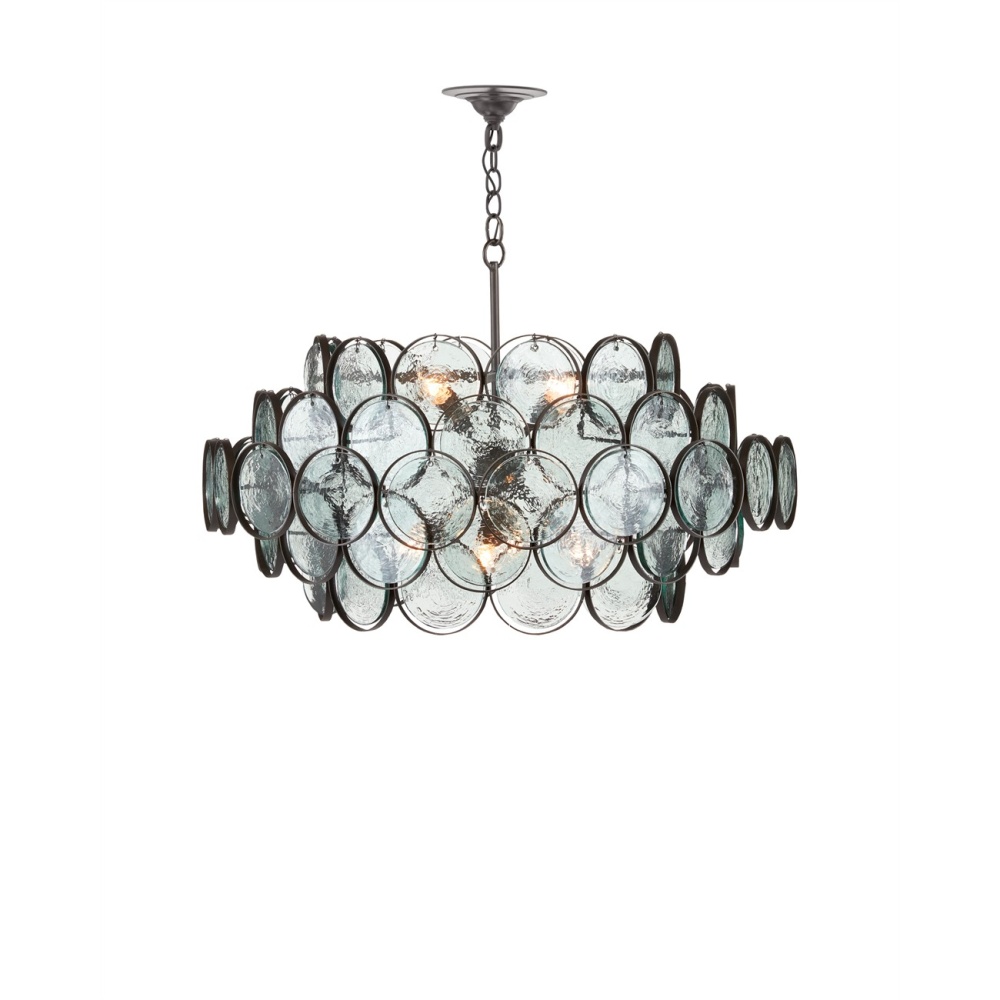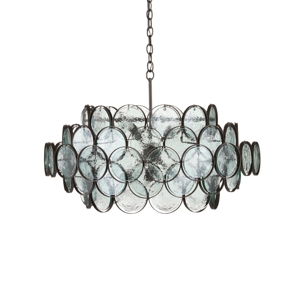 Myriad recycled, recast glass discs are individually attached by hand to hang from a wrought iron frame finished in bronze to make the shapely Galahad Small Chandelier a true statement piece. The ample charm of the fixture is heightened by the glass, as the light source travels around the shade to glint through each one of the discs depending upon the position from which it is viewed. Adjustable from 30.25" to 96.5" with use of included chain/rod kit/cable. If your space calls for a longer drop, additional chain/rods/cable is available for purchase.
