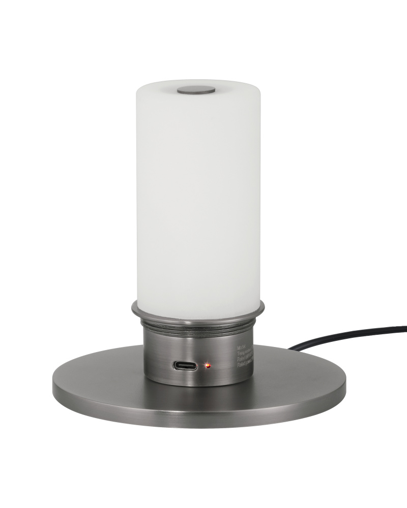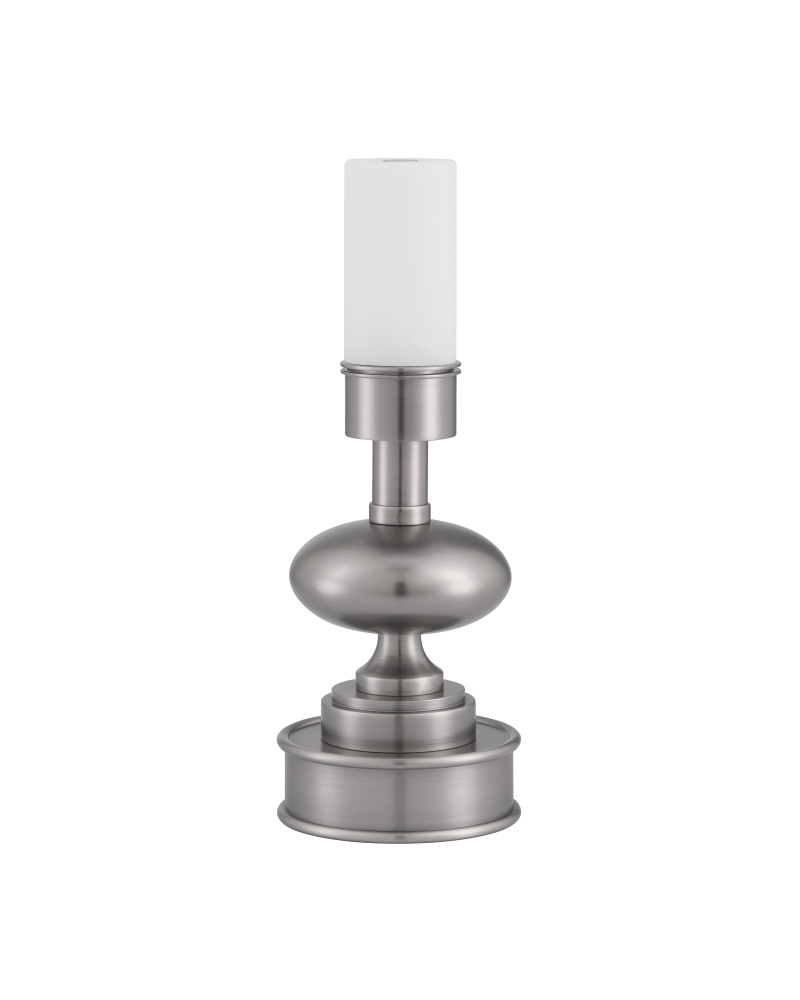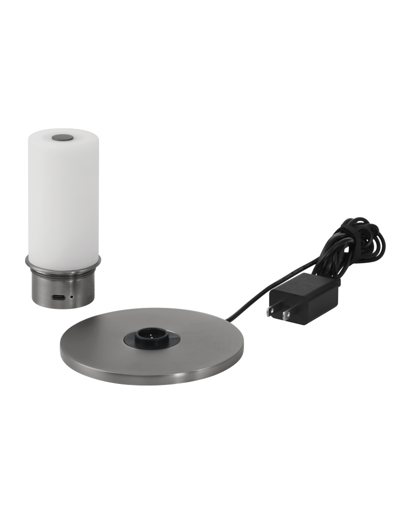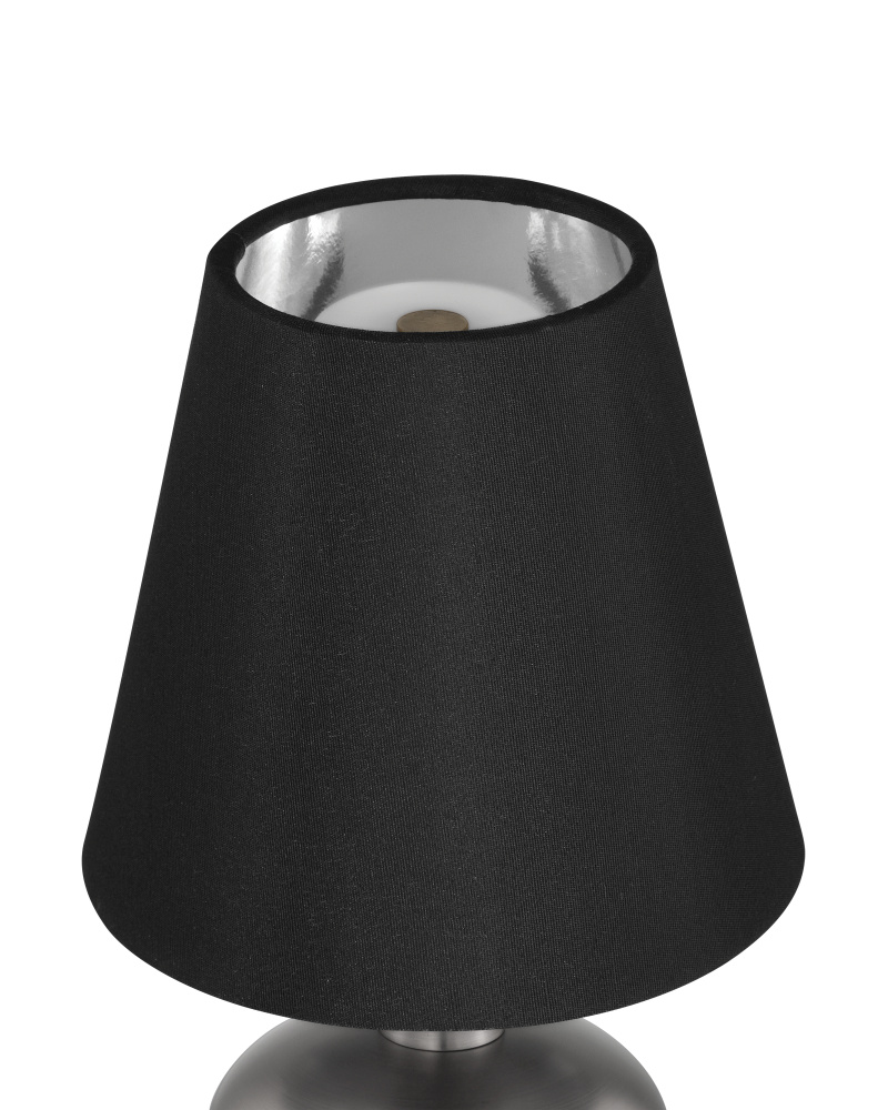 The Galavant Nickel Cordless Table Lamp is a petite silver lamp that makes movement a breeze. The rechargeable bulb sits atop the metal body in a brushed nickel finish and the black shantung shade slides seamlessly over it. The on/off switch is on the top of the bulb, and the shade has a silver foil lining for a luxe touch.