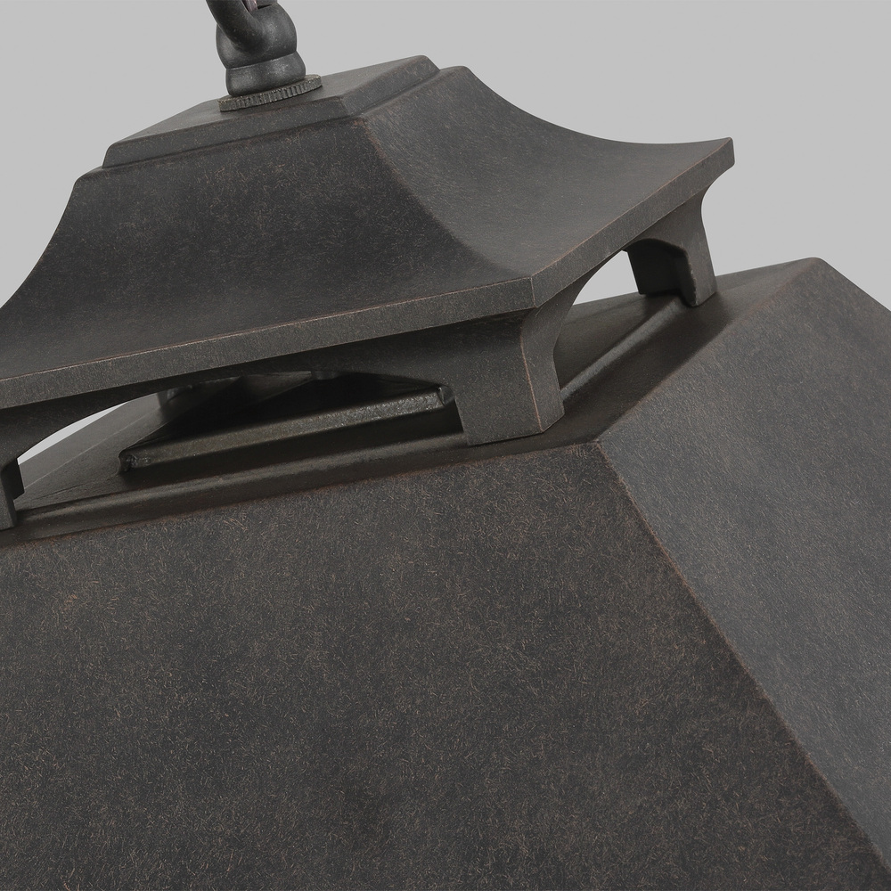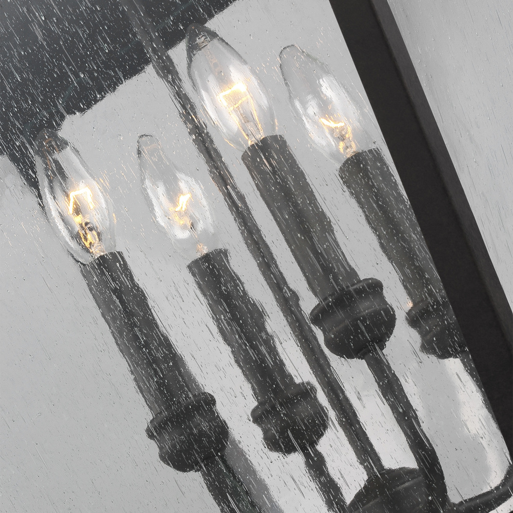 The Sean Lavin Galena four light outdoor pendant fixture in sable creates a warm and inviting welcome presentation for your home's exterior. Galena is a Europe-inspired classic lantern. Simple and refined, Galena features a gently curved hook detail atop a vented, square-off roofline, and candle tubes floating within the tapered clear glass shades. Galena is a warm, welcoming silhouette offered in our NEW Sable finish.