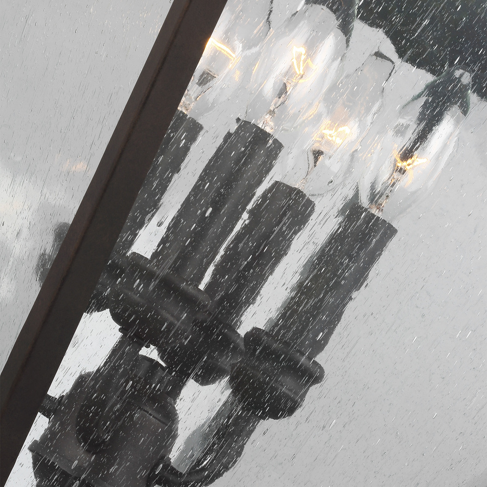 The Sean Lavin Galena four light outdoor post top in sable creates a warm and inviting welcome presentation for your home's exterior. Galena is a Europe-inspired classic lantern. Simple and refined, Galena features a gently curved hook detail atop a vented, square-off roofline, and candle tubes floating within the tapered clear glass shades. Galena is a warm, welcoming silhouette offered in our NEW Sable finish.