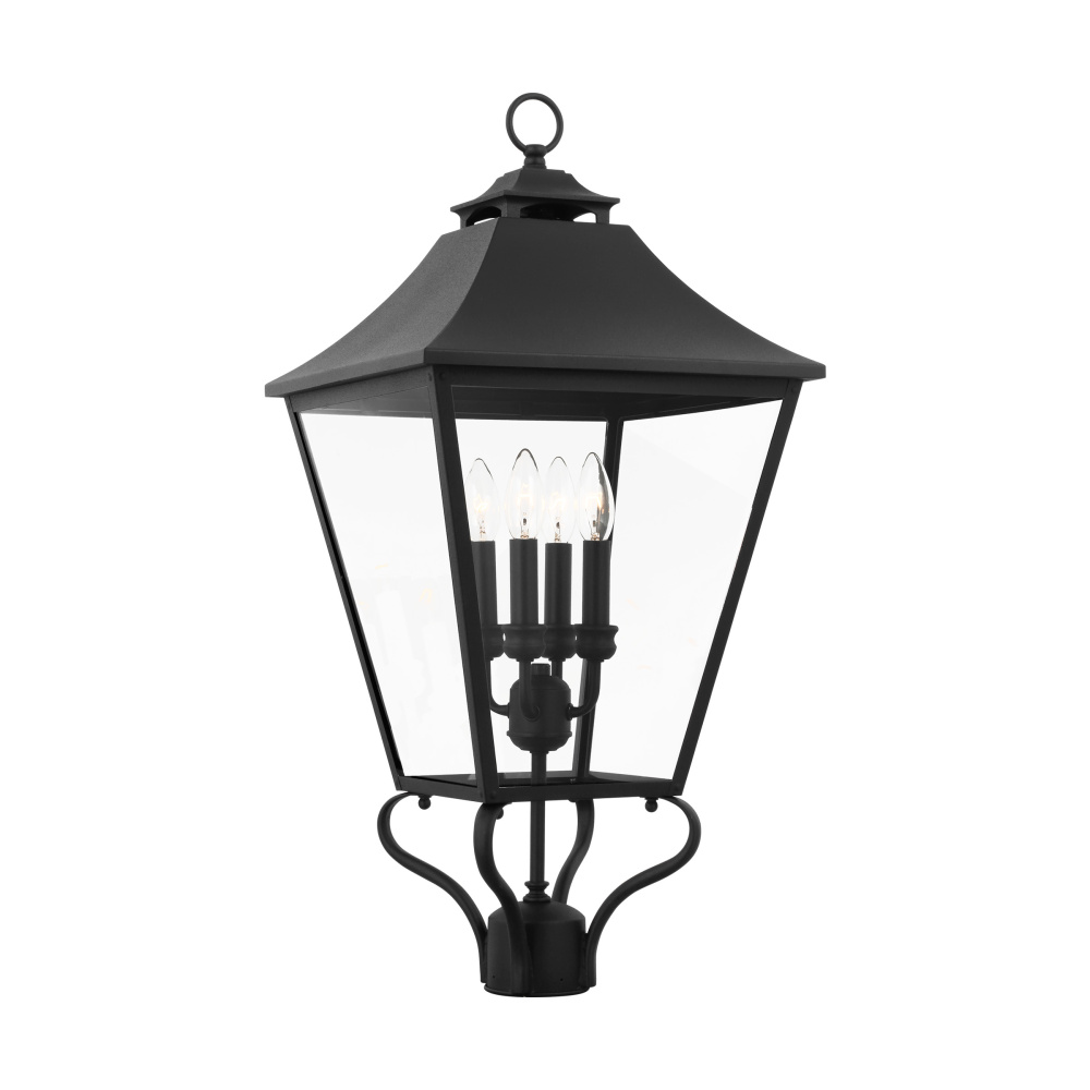 Designed by Sean Lavin, the Galena four-light outdoor post top in textured black enhances the beauty of your property, makes your home safer and more secure, and increases the number of pleasurable hours you spend outdoors. Galena is a Europe-inspired classic lantern. Simple and refined, Galena features a gently curved hook detail atop a vented, square-off roofline and candle tubes floating within the tapered clear glass shades. Galena is a warm, welcoming silhouette offered in a Sable or Textured Black finish.