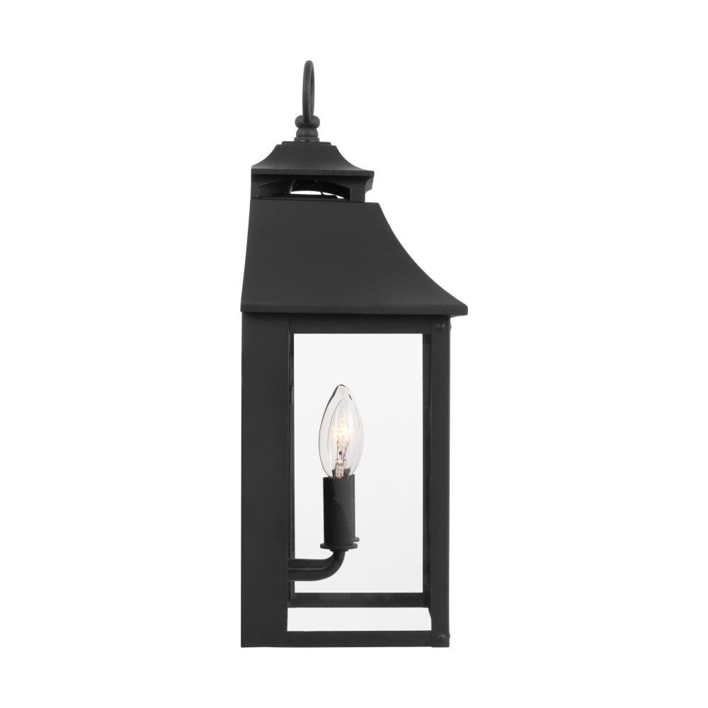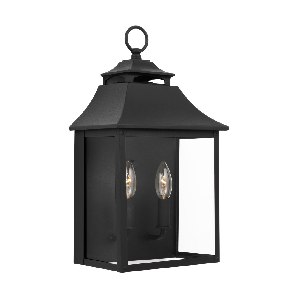 Designed by Sean Lavin, the Galena two-light outdoor wall fixture in textured black enhances the beauty of your property, makes your home safer and more secure, and increases the number of pleasurable hours you spend outdoors. Galena is a Europe-inspired classic lantern. Simple and refined, Galena features a gently curved hook detail atop a vented, square-off roofline and candle tubes floating within the tapered clear glass shades. Galena is a warm, welcoming silhouette offered in a Sable or Textured Black finish.