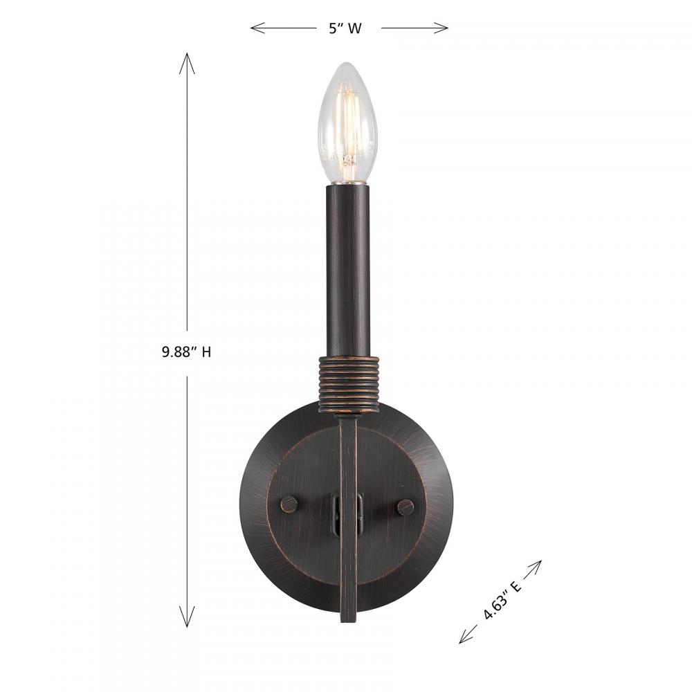 It is often said that lighting is the jewelry of the home. The Savoy House Gardner 1-light sconce perfectly exemplifies this saying! It features a dramatically curving bowtie-like arm that wears a wrapped metal accent as if it was a bangle. This metal accent also adorns the base of the candle. The Champagne Mist finish is bold, beautiful and textural. Gardner is 9.88" in height, 5" in width and extends 4.63" from the wall. It uses one candelabra size bulb of up to 60 watts. Bulb not included. This sconce is damp area rated.
