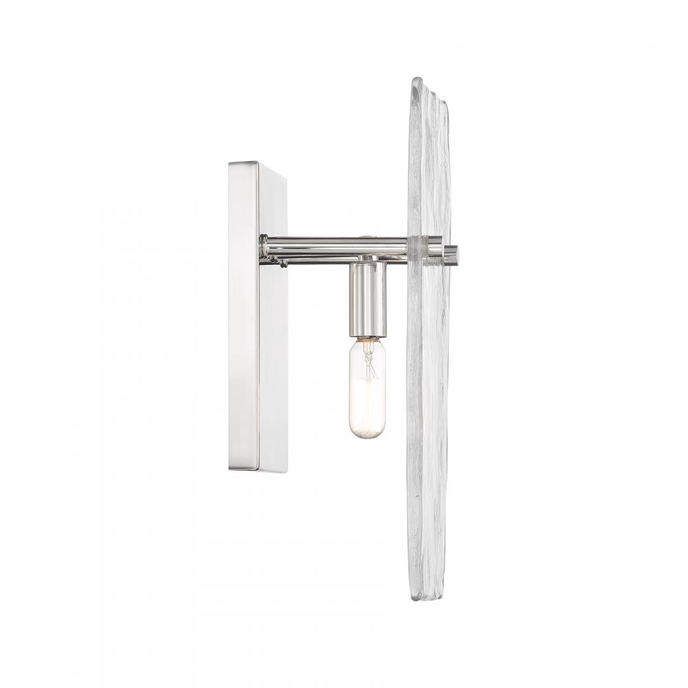 Bring a beautiful ocean-inspired lighting look to your home with the Savoy House Genry 1-light sconce. It is decorated with a rippling pane of handmade glass and finished in Polished Nickel. Genry is 13" in height, 5.5" in width and extends 5.5" from the wall. It uses one candelabra size bulb of up to 60 watts. The bulb is not included. This sconce is damp area rated.