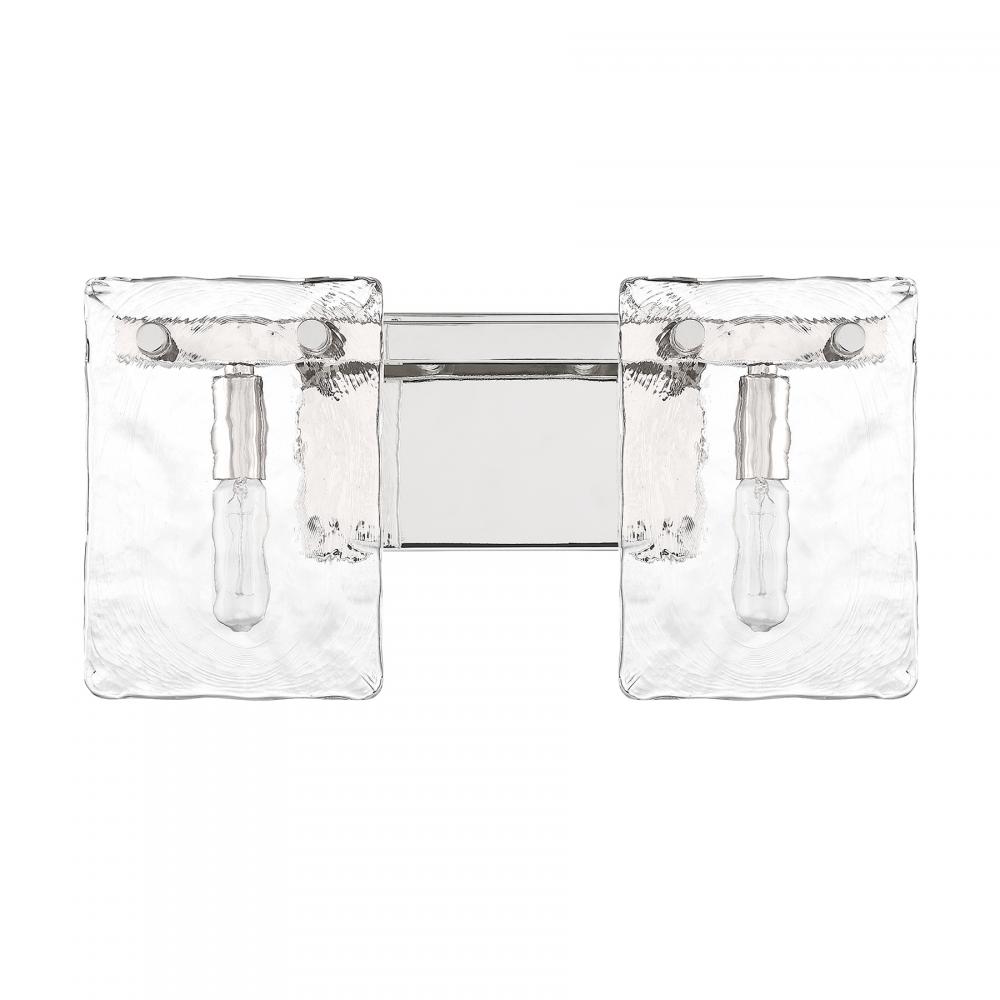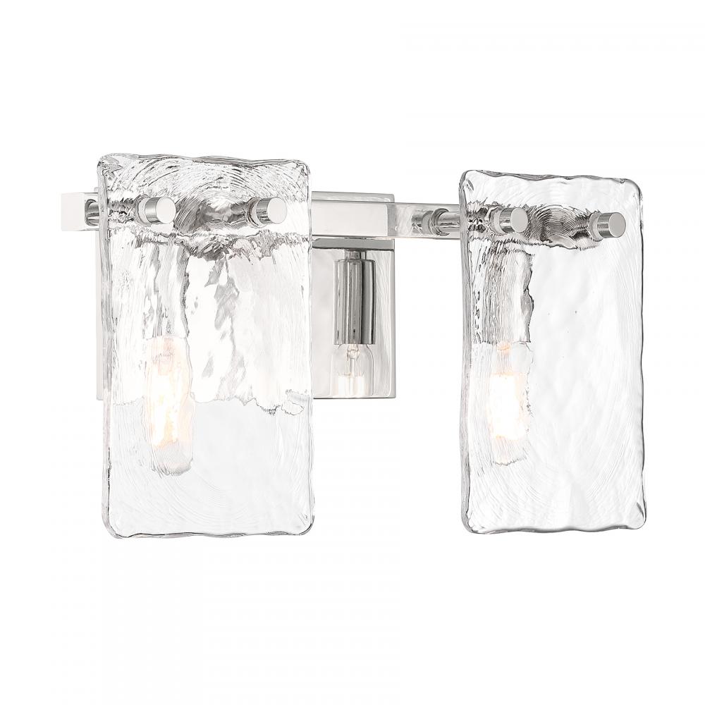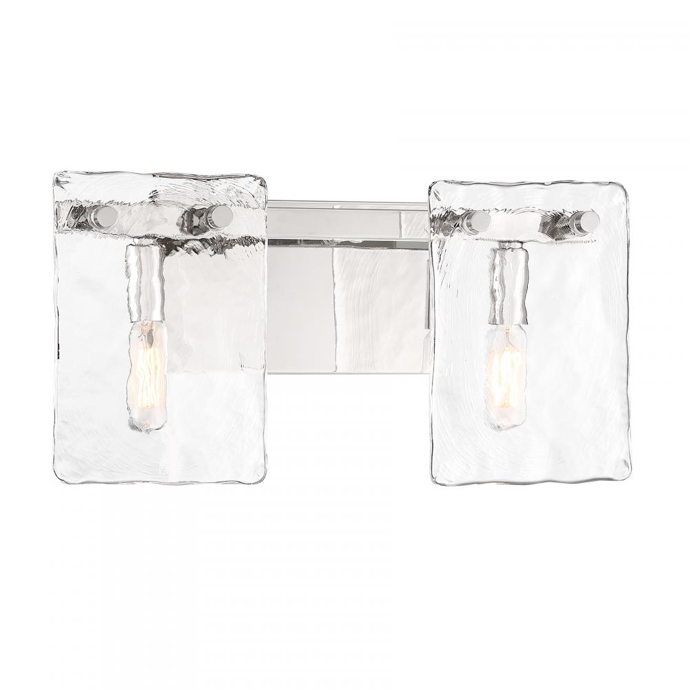 Bring a beautiful ocean-inspired lighting look to your home with the Savoy House Genry 2-light bath bar. It is decorated with rippling panes of handmade glass and finished in Polished Nickel. Genry is 7.75" in height, 15.25" in width and extends 5.5" from the wall. It uses two candelabra size bulbs of up to 60 watts per bulb. Bulbs not included. This bath light is damp area rated and must be installed as shown.