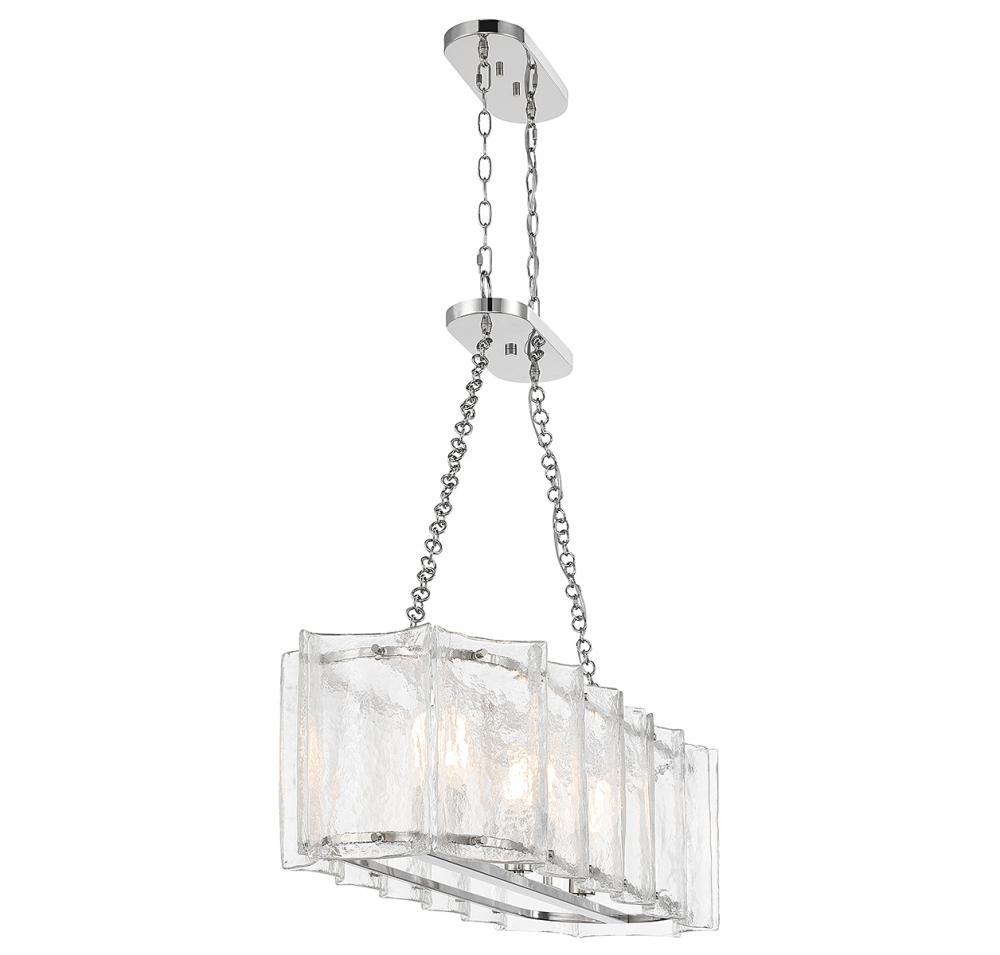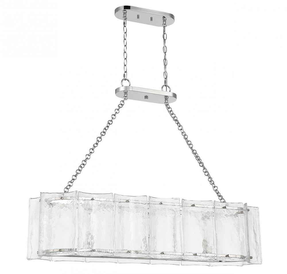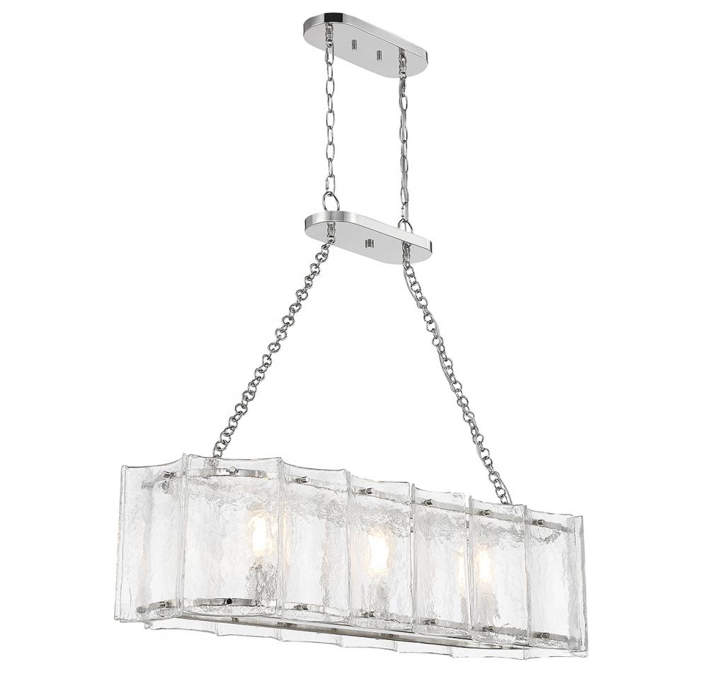 Bring a beautiful ocean-inspired lighting look to your home with the Savoy House Genry 3-light trestle. This linear design is decorated with rippling panes of handmade glass and finished in polished nickel. Genry is 31.5" in height, 41" in length and 13" in width. It uses 3 standard size bulbs of up to 60 watts per bulb (bulbs not included).