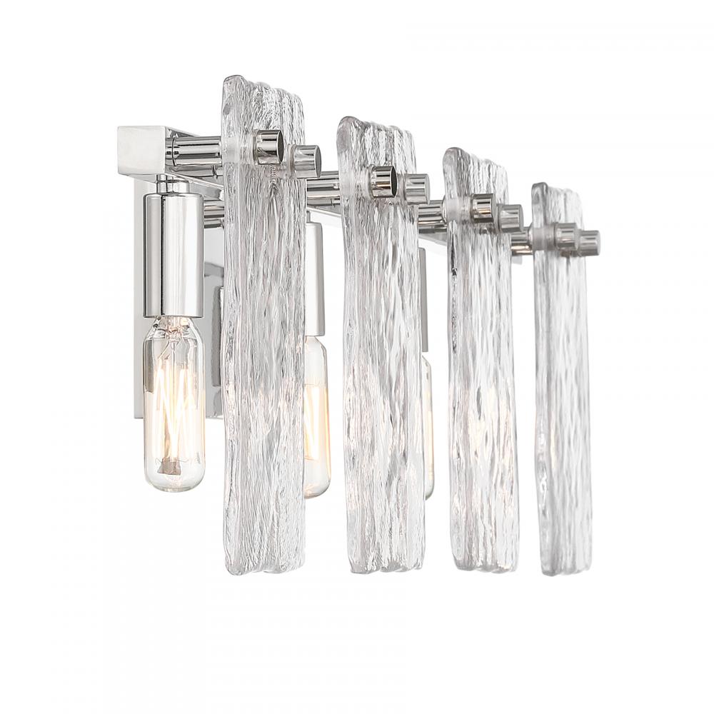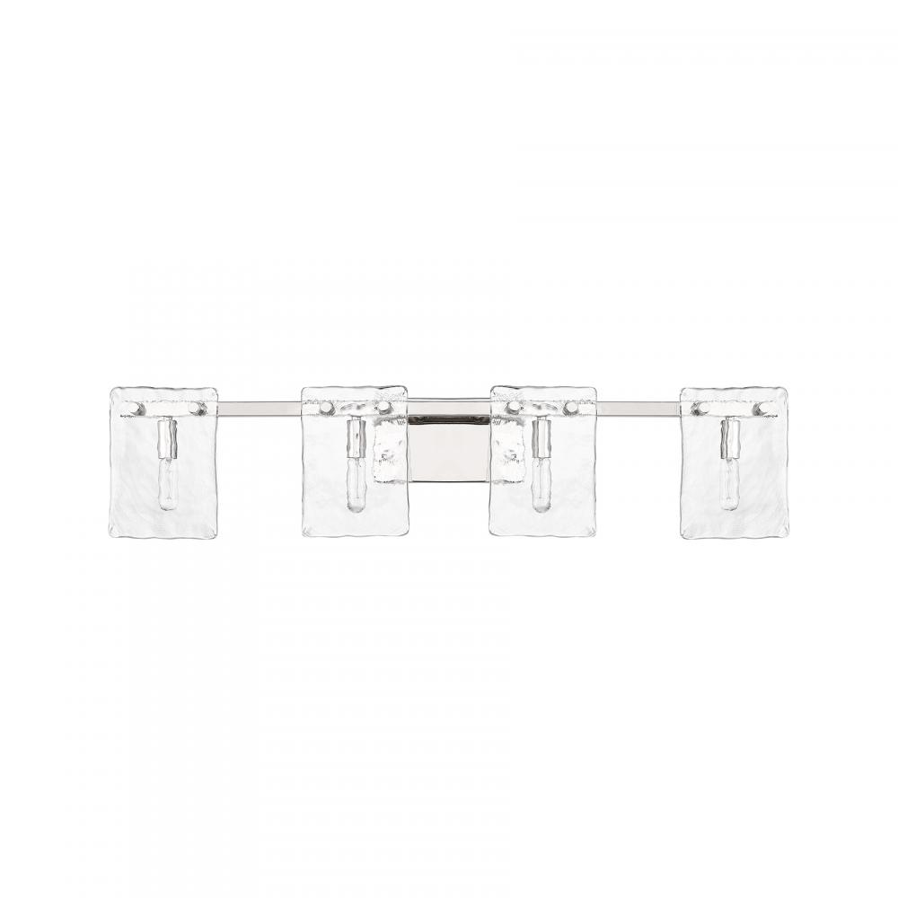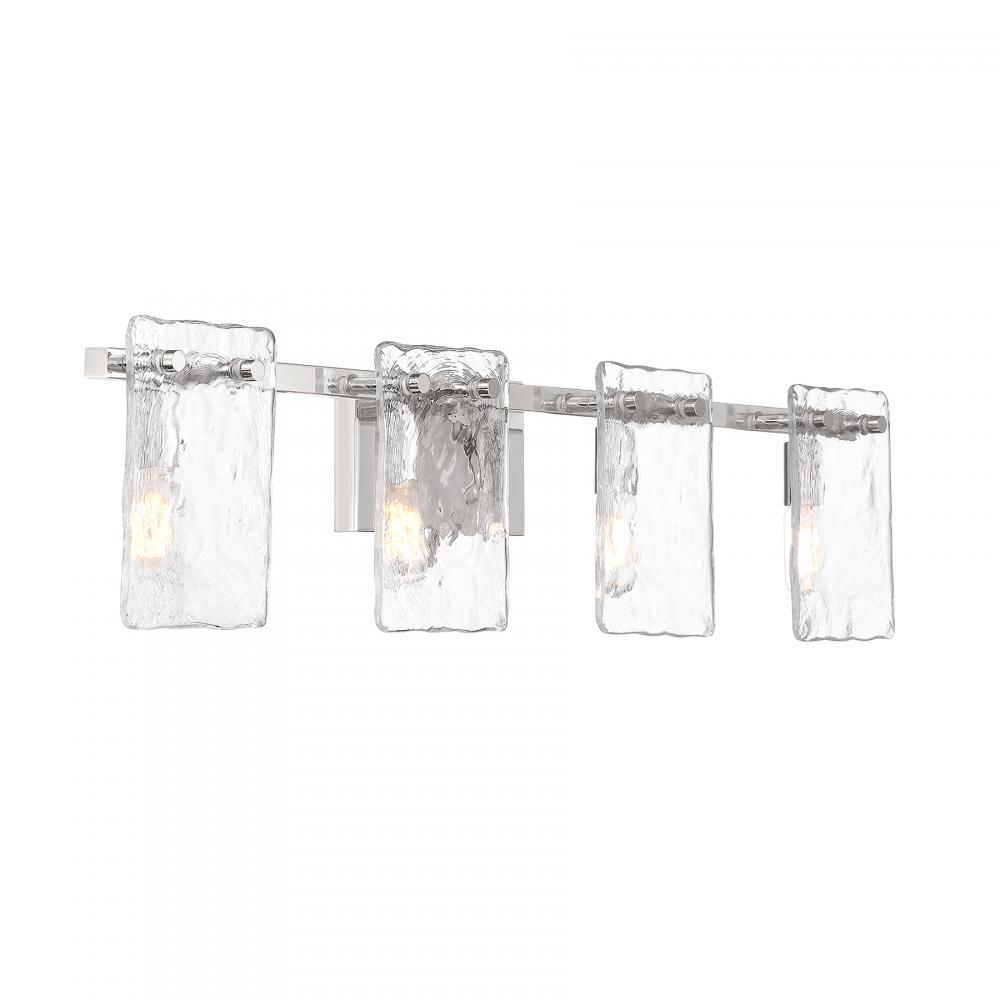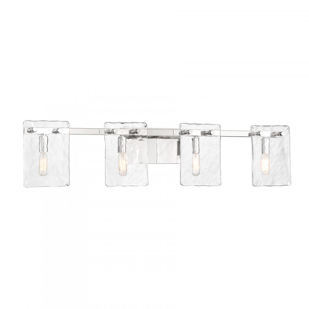 Bring a beautiful ocean-inspired lighting look to your home with the Savoy House Genry 4-light bath bar. It is decorated with rippling panes of handmade glass and finished in Polished Nickel. Genry is 7.75" in height, 35" in width and extends 5.5" from the wall. It uses four candelabra size bulbs of up to 60 watts per bulb. Bulbs not included. This bath light is damp area rated and must be installed as shown.