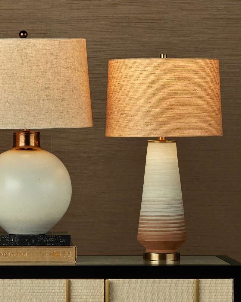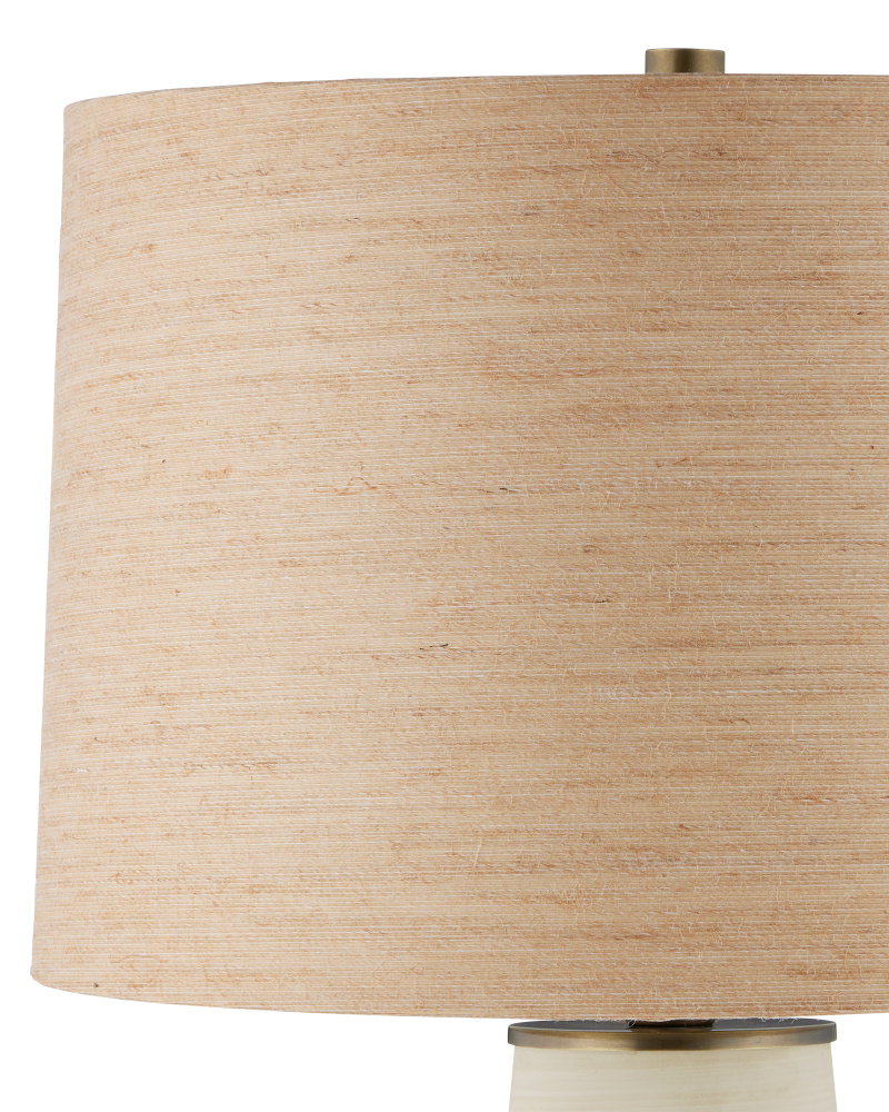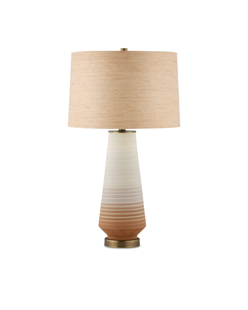 The patterning on the surface of the Geologie Table Lamp takes great skill to create because it is glazed while it is on the wheel, which requires steady hand-eye coordination. Made of porcelain in a mix of beige, pale gray, and brown, the body of the lamp sits atop a metal base in an antique brass finish. A finial in the same finish fastens the textural shade to the lamp, which echoes the darker tones where the body meets the base.