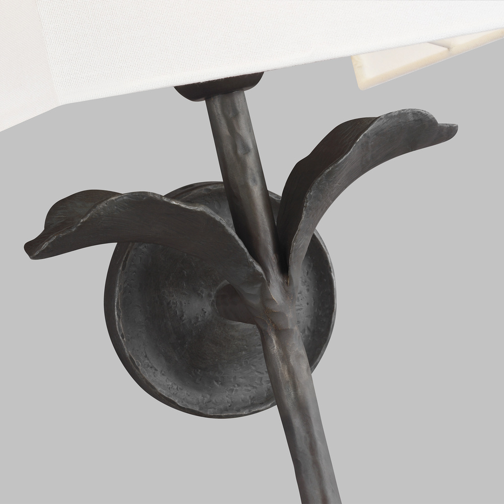 The Georgia one light wall sconce in aged iron offers shadow-free lighting in your powder room, spa, or master bath room. The Georgia Wall Sconce channels the natural beauty of flourishing leaves with perfect symmetry balanced by a circular backplate and a rectangular shade in fresh White Linen. Superior craftsmanship using a lost-cast wax technique results in a textured Aged Iron finish that resembles hand-forged iron.