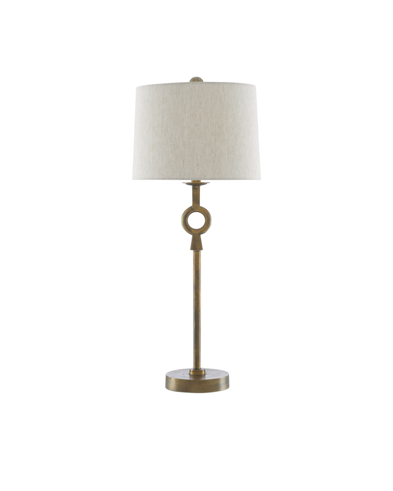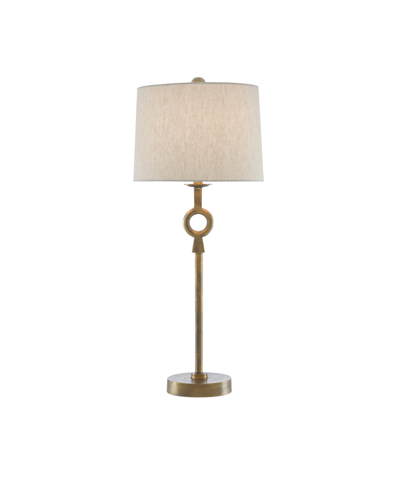 The Germaine Table Lamp has a cleverly placed circlet on its stem-like body made of aluminum in an antique brass finish. A finial in the same finish fastens the natural cotton flax shade to the brass lamp.