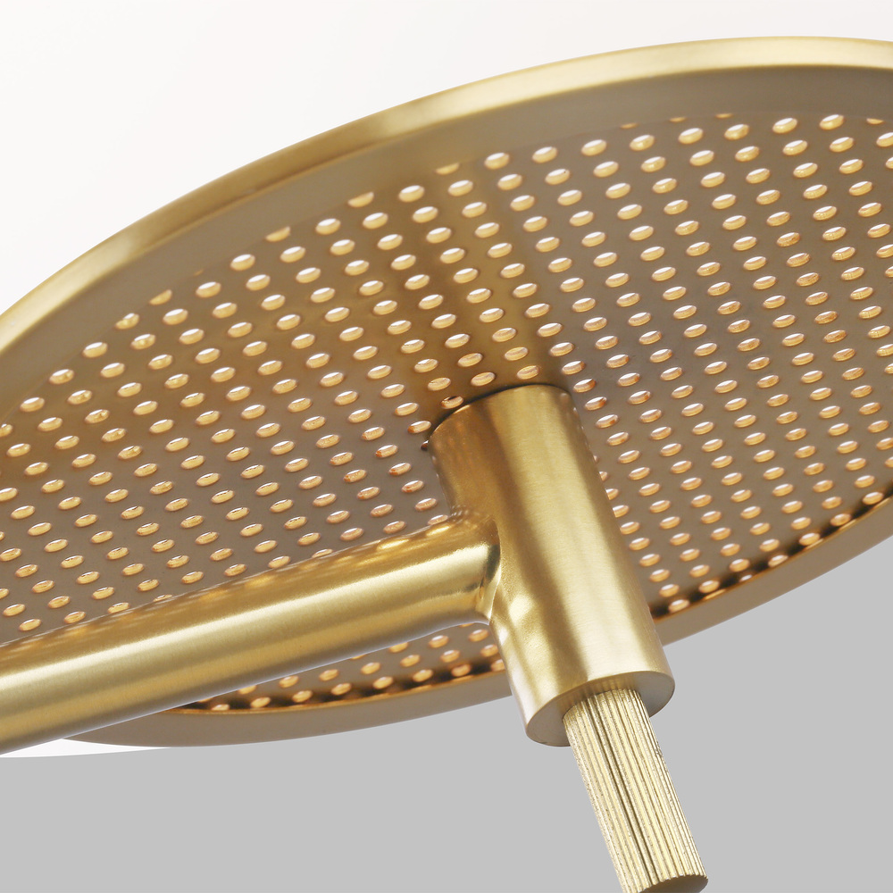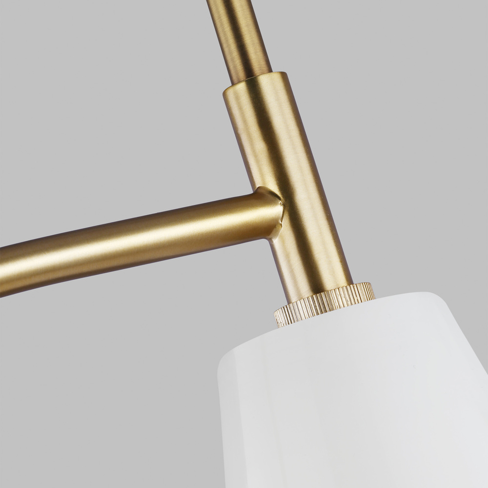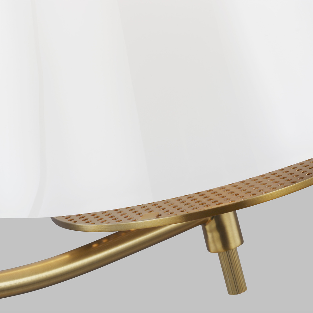 A dramatic and architectural take on Kelly’s signature use of mixed metals and geometric forms, Gesture pendant lights have asymmetrical balance. The “C” arm hook holds a milk glass shade with a perforated metal diffuser at the base of the lamp. The diffuser shines light straight out and down, ensuring gentle, even distribution of the light. Available in three finish options: Aged Iron, Burnished Brass and Polished Nickel. This product is on the cover of the GL Designer catalog.