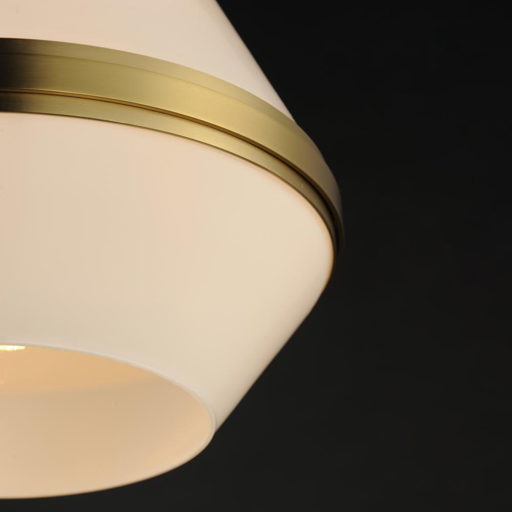 A glossy White glass shade, conical in form, is combined with sharp-lined bands of metal finished in your choice of Polished Nickel or Satin Brass to create a pyramid of softly diffused light. Squared off trapezoidal chain loops connect to squared chain li