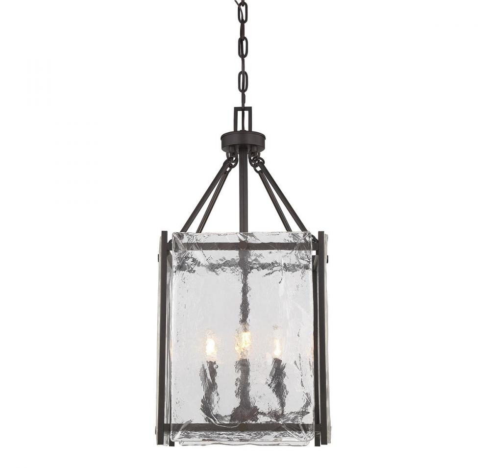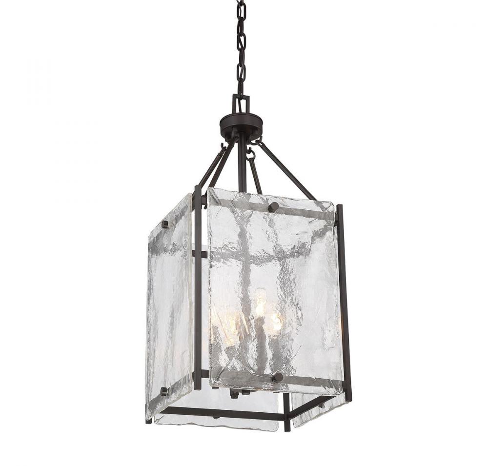 In the Savoy House Glenwood 4-light pendant, strong geometric lines combine with gorgeous glass for a look you'll love every day. Designed by Brian Thomas, the straightforward framework of the Glenwood has a classic English bronze finish that blends well with other hardware in your home. The rectangular lantern has a metal grid frame and panes of Piastra glass, creating an artisan aesthetic. The four 60W candelabra size bulbs provide plenty of light and the 14" wide by 30.13" high size is ideal for your dining room, kitchen, foyer, living room, entryway, family room, great room, office, bar or stairway.