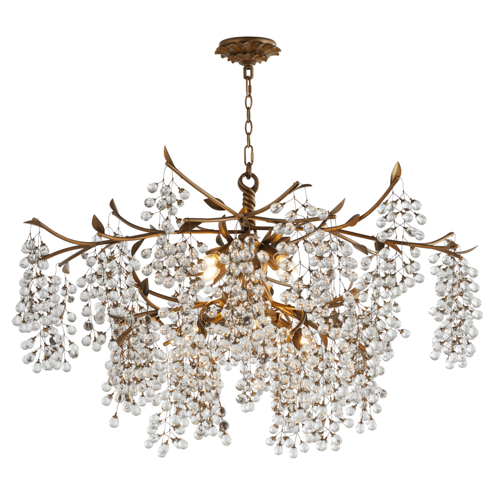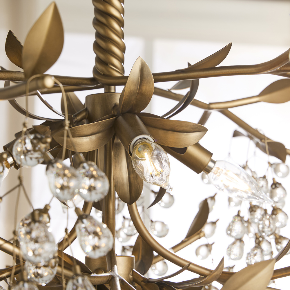 Glicina is an oversized organic chandelier that exudes elegance, with clusters of grape-sized crystals cascading from each stem to create a shimmering, romantic glow. Delicately shaped leaves and a twisting stem extend upward, leading to a beautifully detailed floral canopy. A natural brass finish enhances its estate-style appeal, bringing warmth and sophistication to the design.