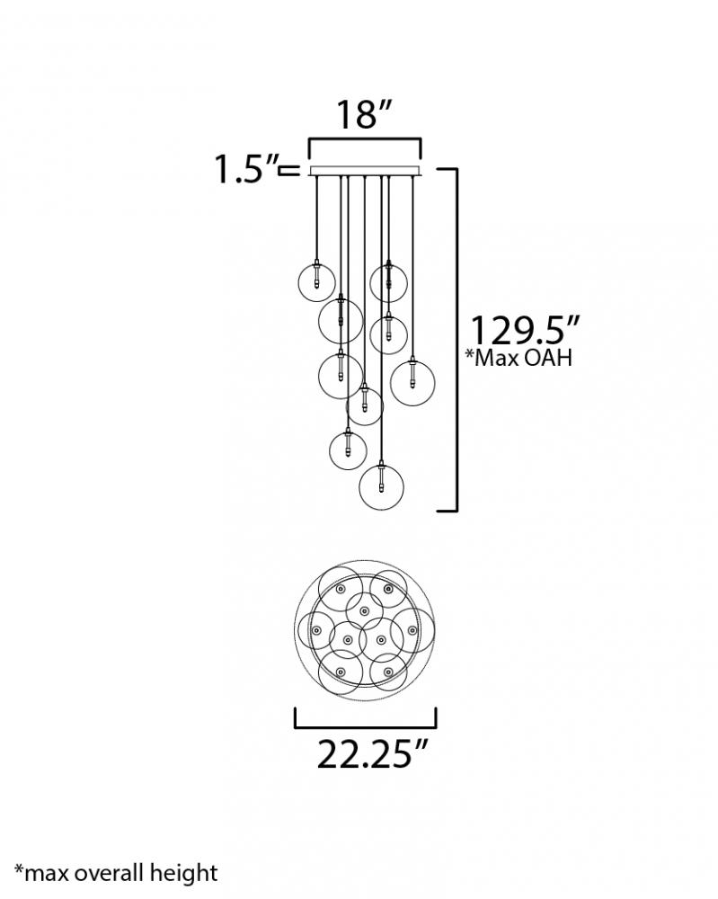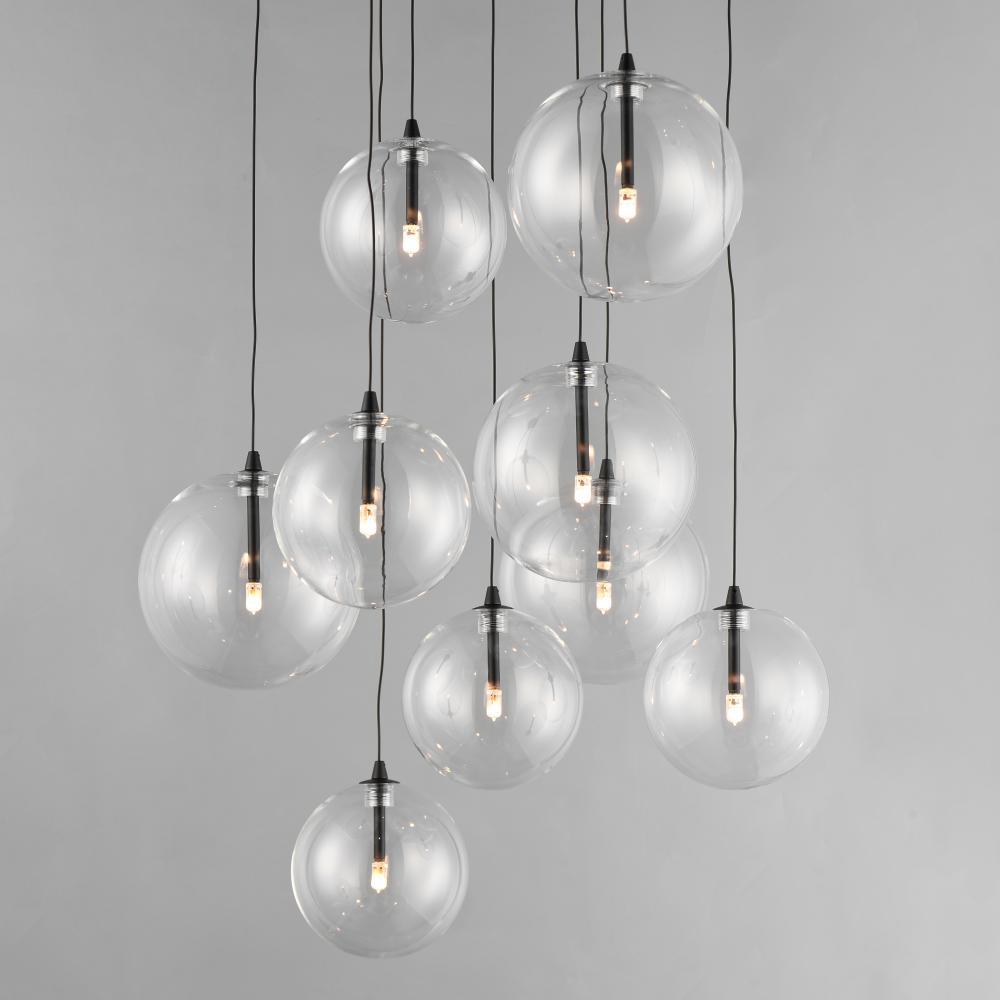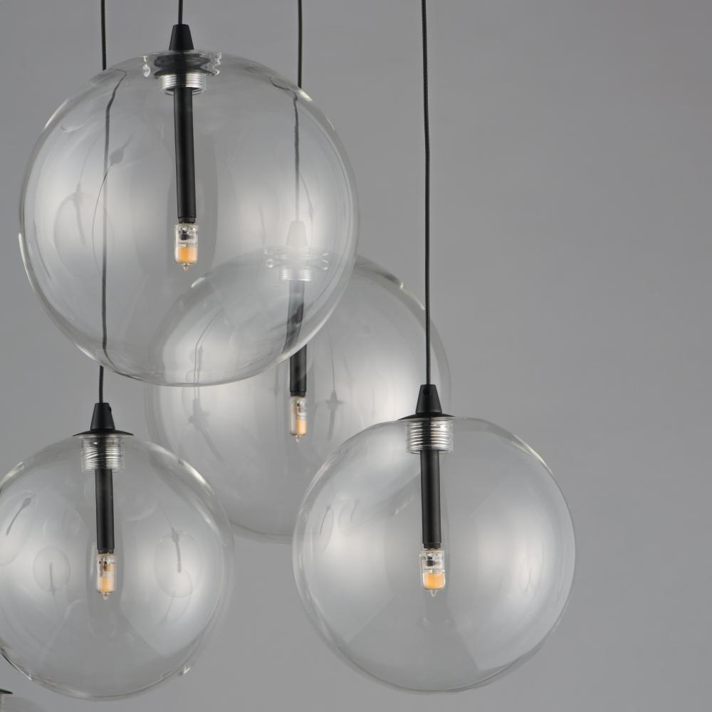 An airy configuration of Clear blown glass globe shades in various sizes suspend on thin low voltage wires. Thin tubes finished in Black or Gold descend into the center of the globes where a small G4 LED lamp provides a spark of light.