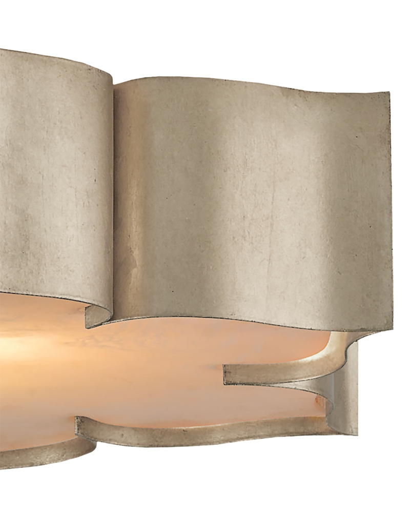 The Go-Go Flush Mount has a mid-century vibe with a shapely twist. The white opaque glass that makes up the vertical diffuser is slotted between two sheets of wrought iron that have been treated to a brass finish and off-set to create half-moon shapes within the row of circles on the flush mount. The bottom diffuser on this two-light fixture is also made of opaque glass. We offer a Go-Go pendant with the same dance of circles around its surface.
